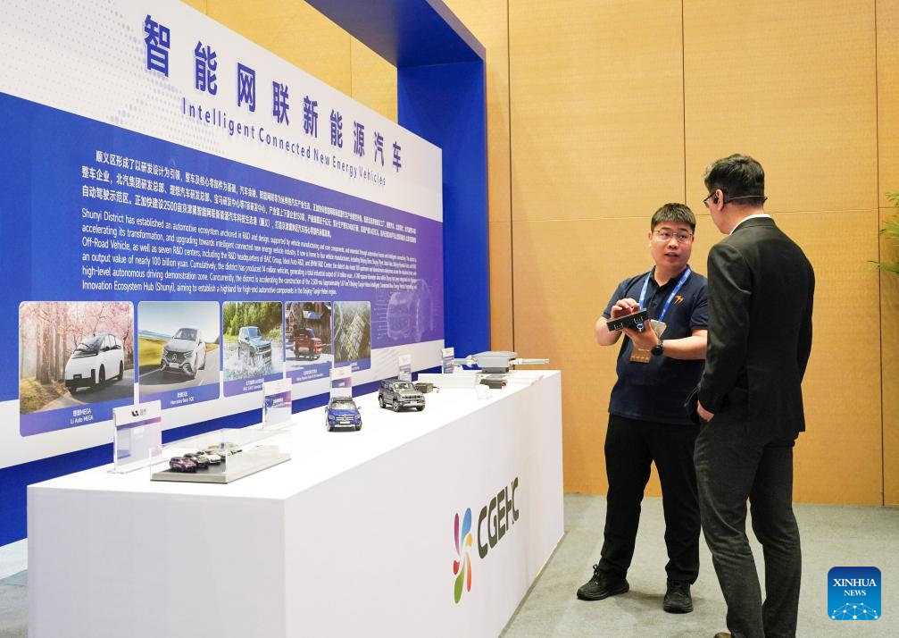 A staff member introduces intelligent connected new energy vehicles to a participant during an event of the China-Germany (China-Europe) Hidden Champions Forum 2025 in Beijing, capital of China, May 26, 2025. The China-Germany (China-Europe) Hidden Champions Forum 2025 kicked off here on Monday. (Xinhua/Zhang Chenlin)