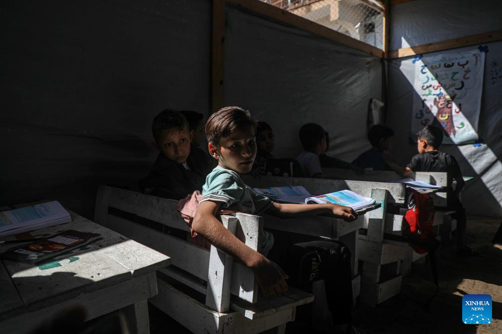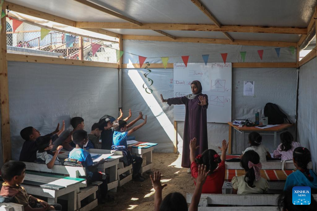 Palestinian students are seen in a makeshift classroom inside a tent in central Gaza City, on May 25, 2025. (Photo by Rizek Abdeljawad/Xinhua)