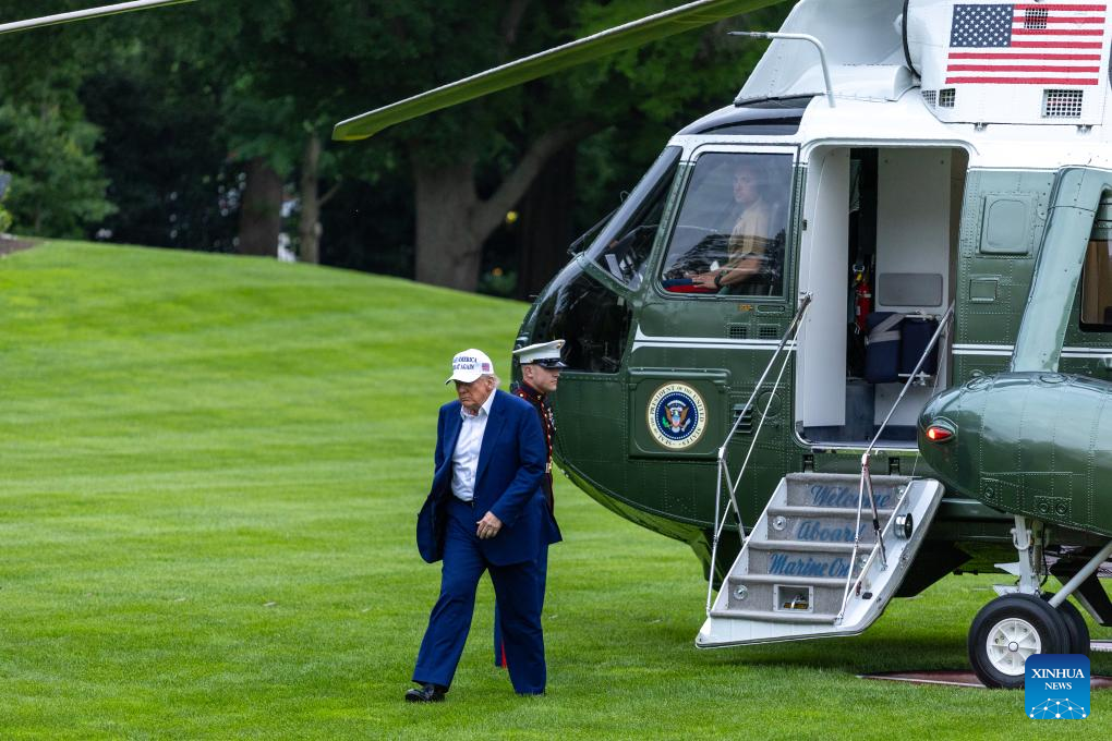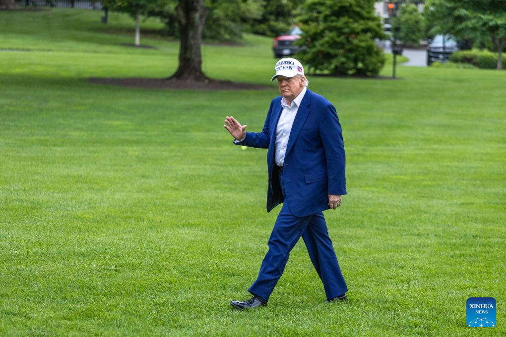 U.S. President Donald Trump walks upon his return to the White House in Washington, D.C., the United States, on May 25, 2025. U.S. President Donald Trump said Sunday that he agreed to postpone the planned 50 percent tariff on imports from the EU until July 9. (Xinhua/Hu Yousong)