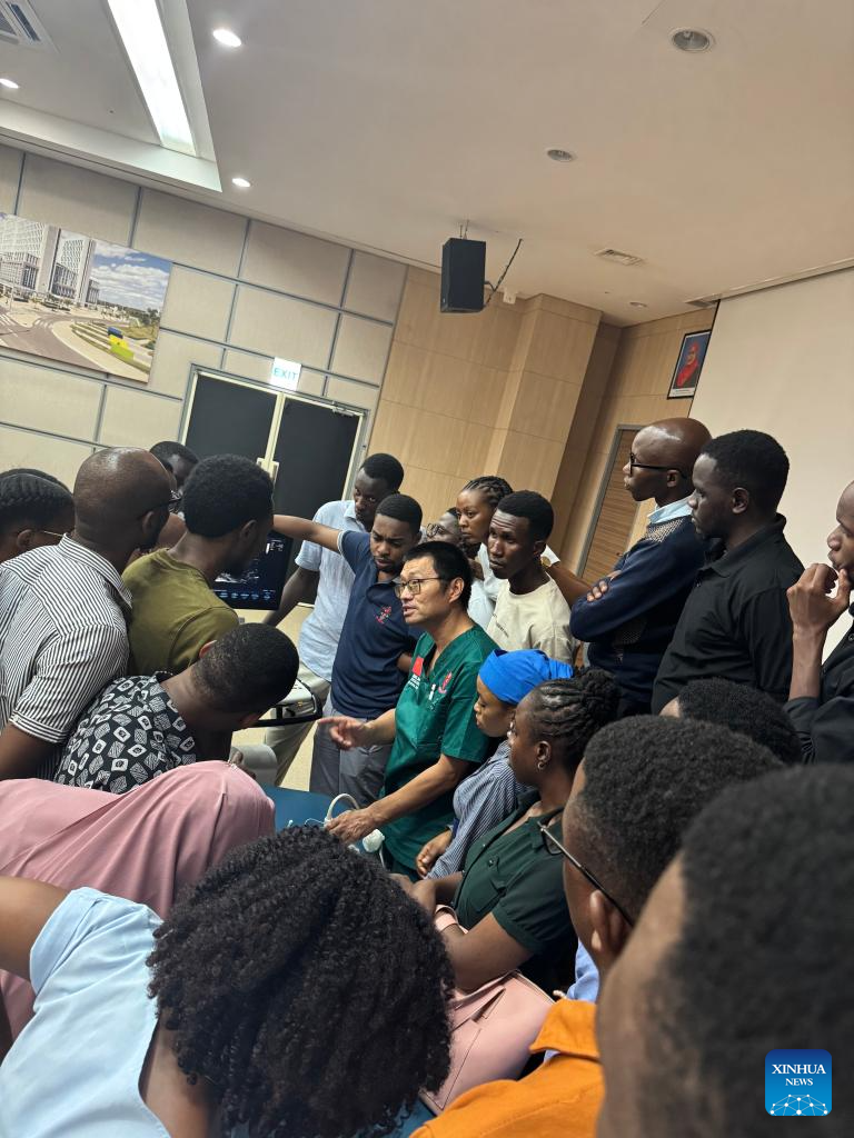 Zhang Junqiao (C),head of the 27th batch of the Chinese medical team in Tanzania, provides a training session on ultrasound-guided regional nerve block anesthesia to local anesthesiology healthcare professionals and students, in Dar es Salaam, Tanzania, May 25, 2025. (The 27th batch of the Chinese medical team in Tanzania/Handout via Xinhua)