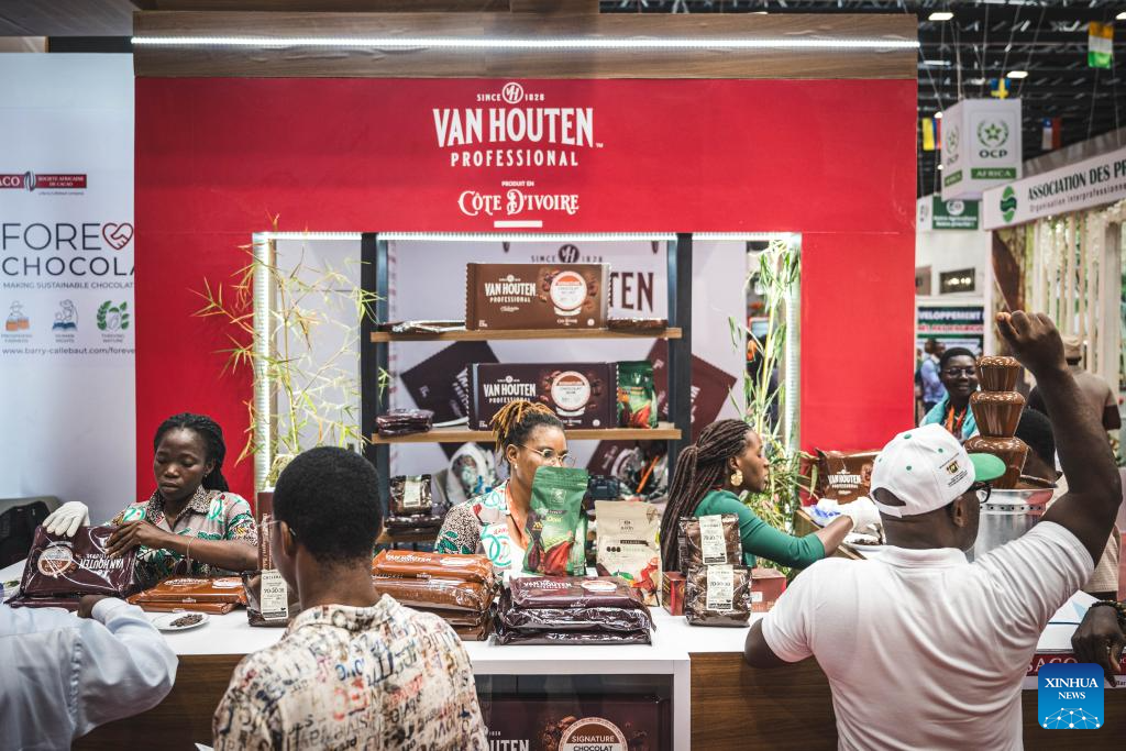 Exhibitors sell cocoa products during the 7th Abidjan International Exhibition of Agriculture and Animal Resources in Abidjan, Cote d'Ivoire, May 26, 2025. The exhibition, a major agricultural fair in West Africa, opened on May 23, 2025, with China participating as the guest of honor. In a 10-day term, the fair is expected to draw more than 500,000 visitors and nearly 1,000 exhibitors showcasing products and services from across Africa, Asia and Europe. (Xinhua/Wang Guansen)