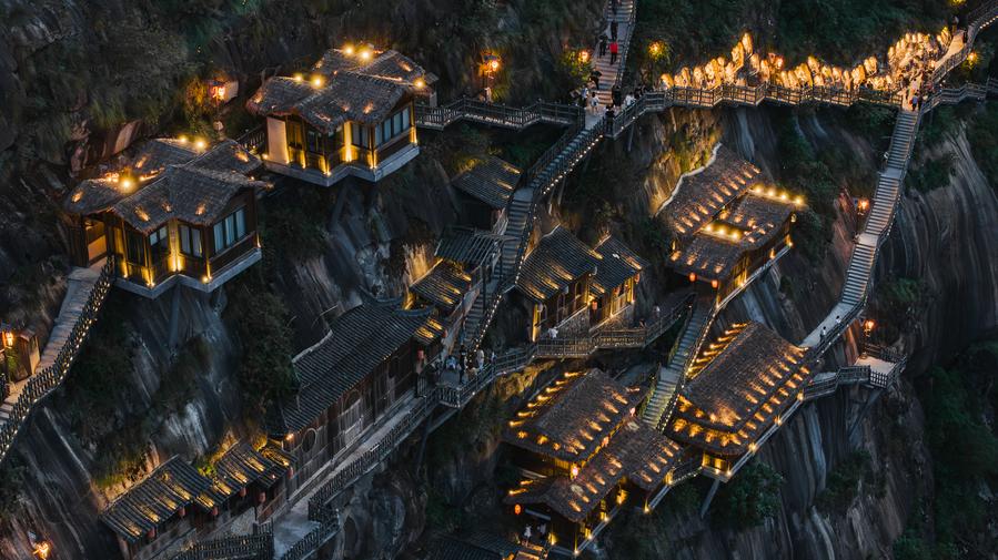 NANCHANG, May 27 (Xinhua) -- Imagine standing on a balcony at night, the ground disappearing into a dark abyss below while a pattern of glittering stars stretches endlessly across the sky canvas above. This breathtaking scene is a reality at a cliffside hotel in east China.