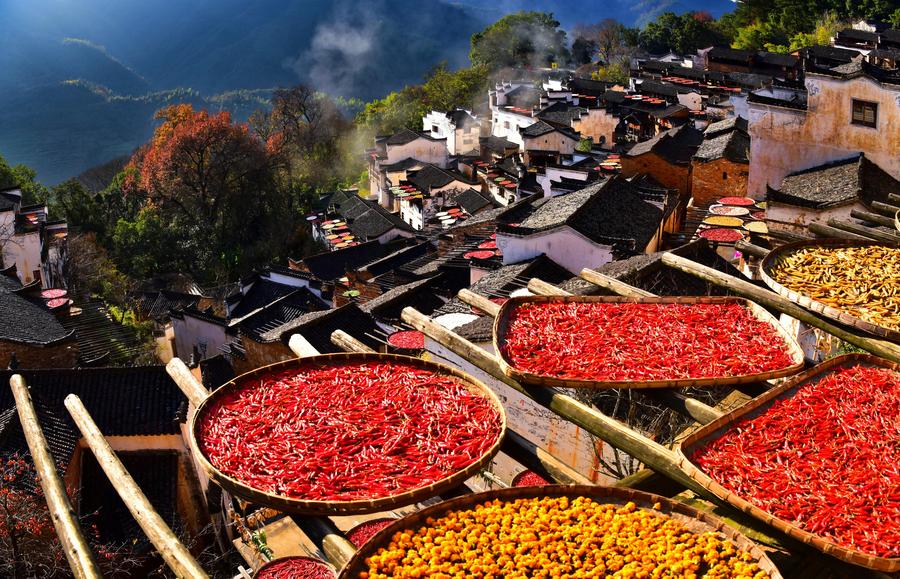 The traditional local scene of drying crops on bamboo trays in autumn, known as Shaiqiu, has been reimagined as a tourism trademark. Vast terraced fields have been planted with rapeseed flowers, while the once dilapidated Huizhou-style cliffside buildings have been turned into homestays.