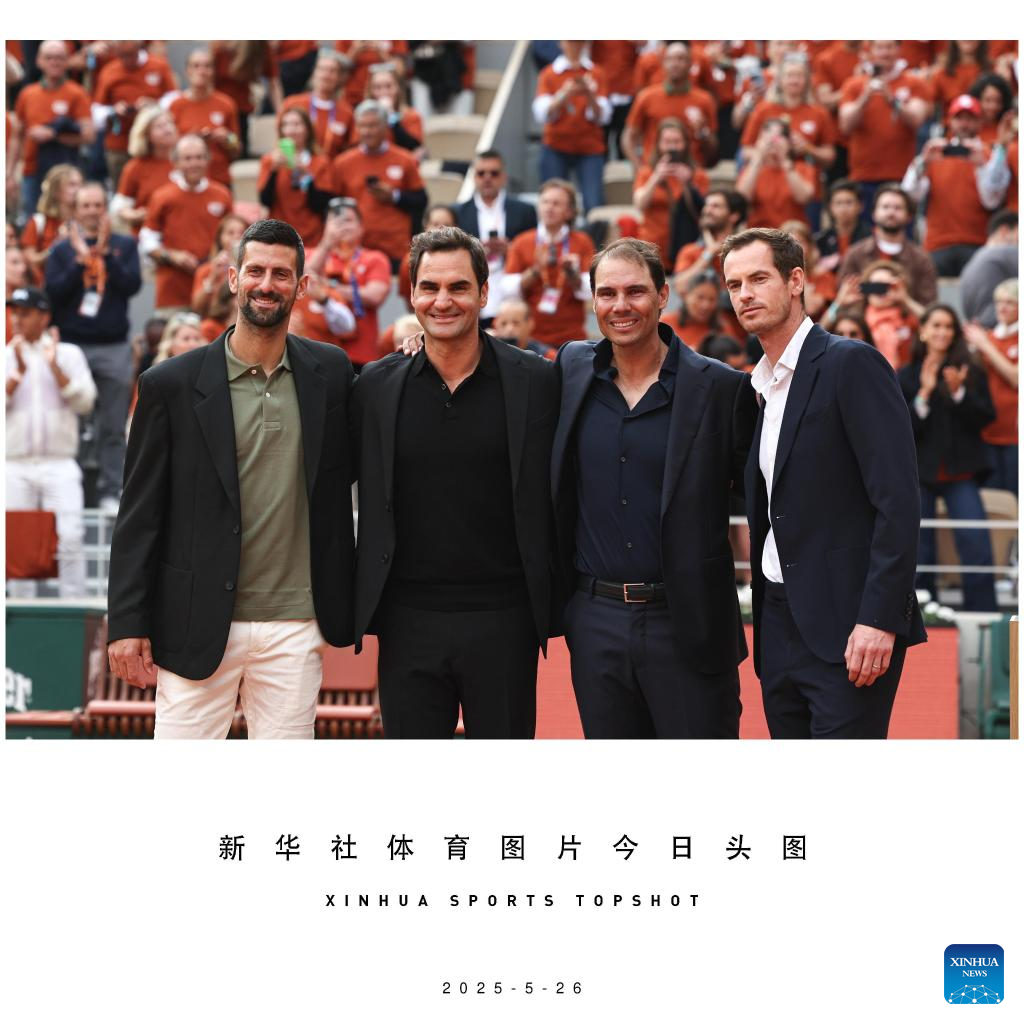 Andy Murray, Rafael Nadal, Roger Federer and Novak Djokovic (from R to L) pose for a photo during a ceremony held for former Spanish tennis player Rafael Nadal honoring his career during the French Open tennis tournament on Court Philippe Chatrier at the Roland Garros in Paris, France, May 25, 2025. (Xinhua/Li Jing)