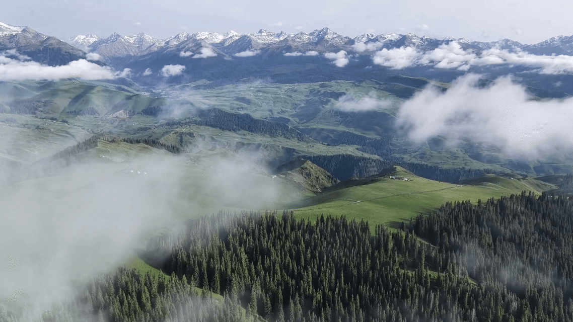 ILI, May 27 (Xinhua) -- After an early summer rain, the Kalajun Grassland in Ili River Valley of northwest China's Xinjiang Uygur Autonomous Region emerges with mist-shrouded forests and rolling hills.