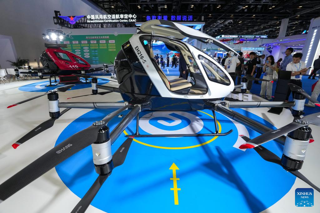 Visitors view the passenger-carrying autonomous aerial vehicle system that can be applied to urban air traffic at the booth of EHang during the 3rd Exhibition of Technology and Education in Civil Aviation in Beijing, capital of China, May 26, 2025. (Xinhua/Ju Huanzong)