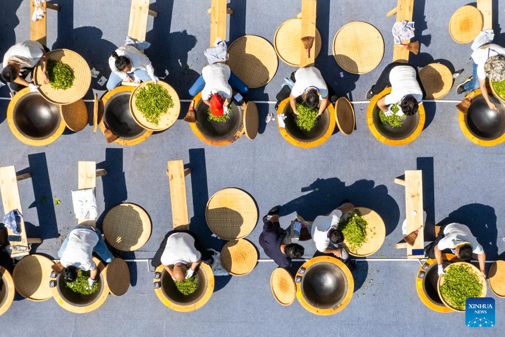 An aerial drone photo shows contestants vying during a handcrafted tea-making skills competition at the Qinglongyan scenic area of Shuangpai County in Yongzhou City, central China's Hunan Province, May 26, 2025. (Xinhua/Chen Sihan)
