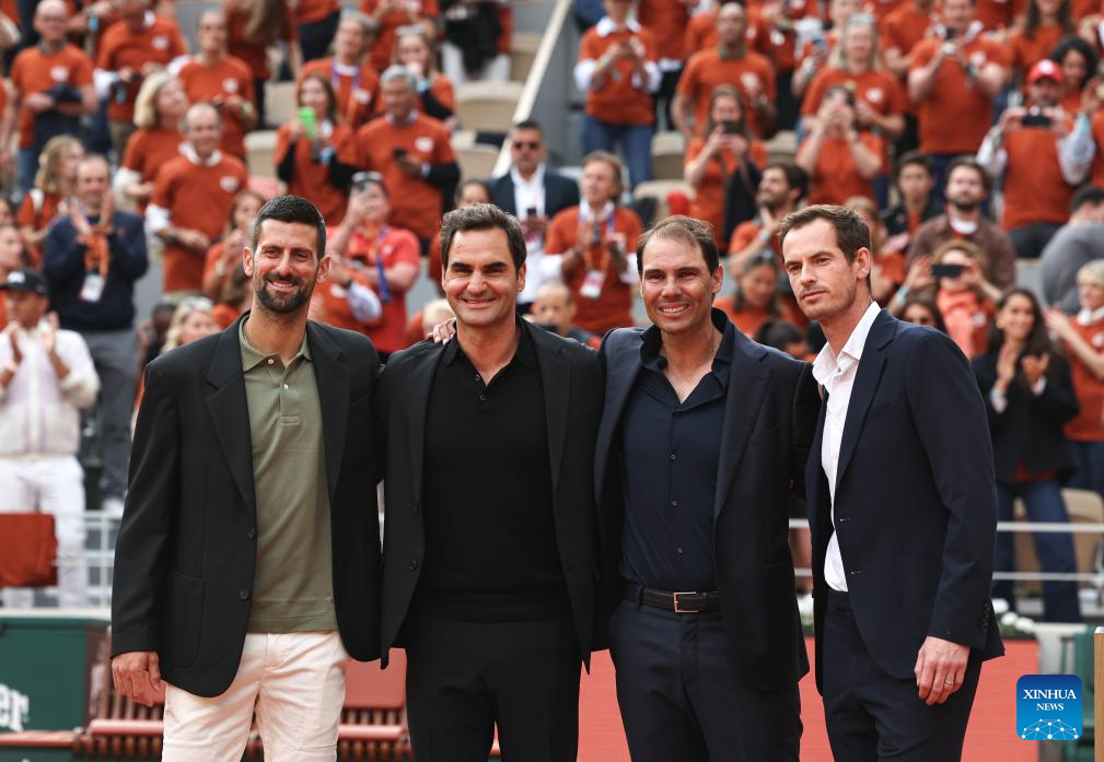 Andy Murray, Rafael Nadal, Roger Federer and Novak Djokovic (from R to L) pose for a photo during a ceremony held for former Spanish tennis player Rafael Nadal honoring his career during the French Open tennis tournament on Court Philippe Chatrier at the Roland Garros in Paris, France, May 25, 2025. (Xinhua/Li Jing)