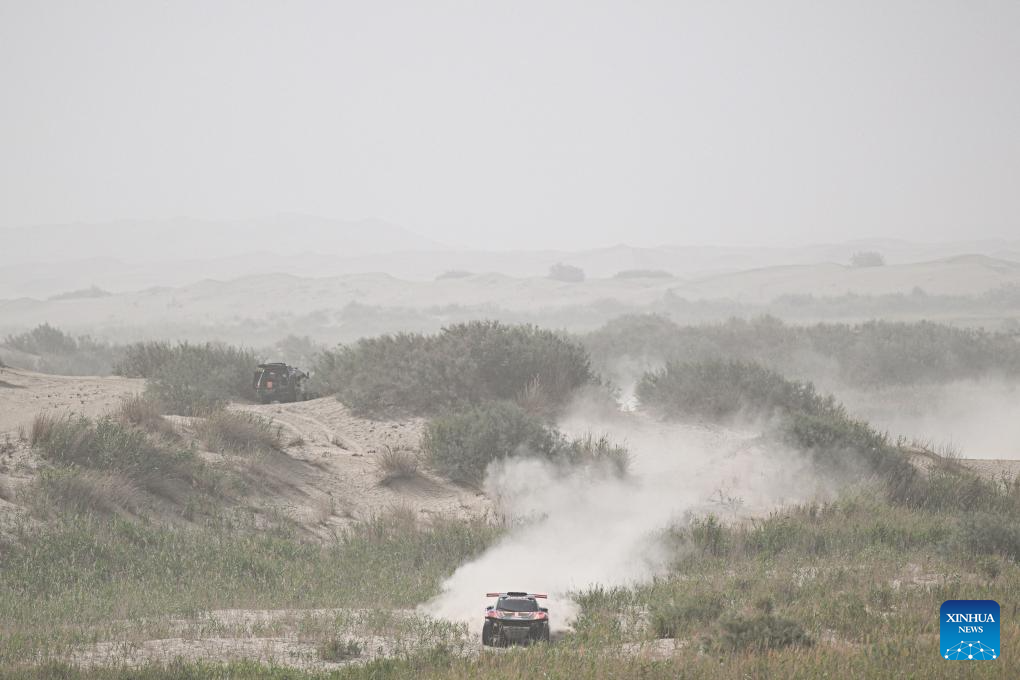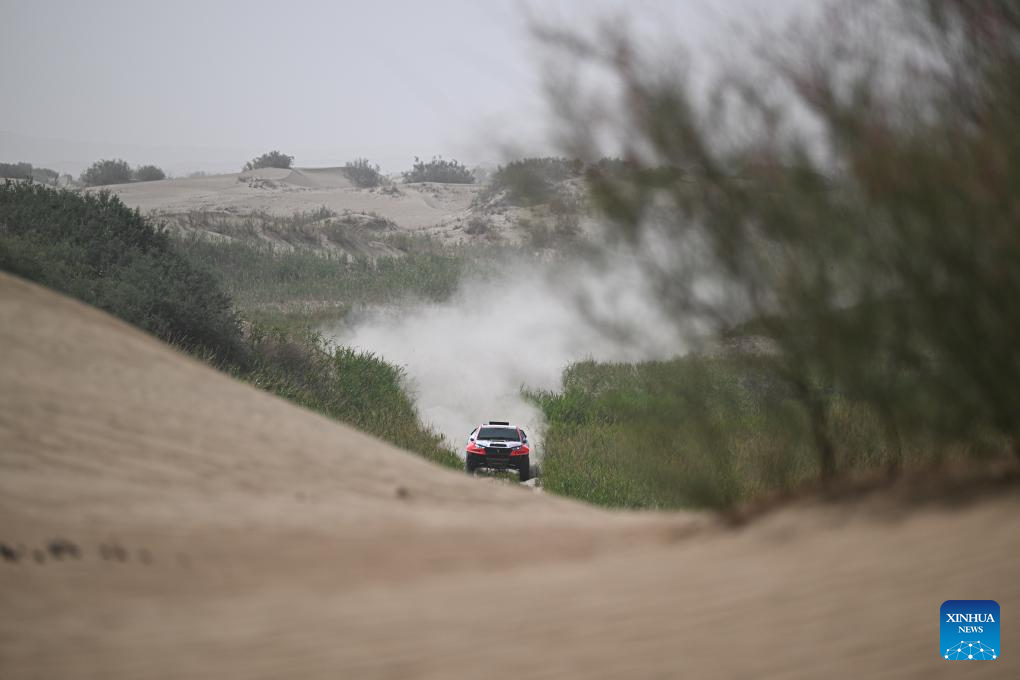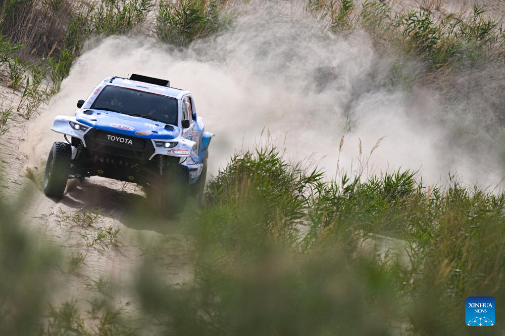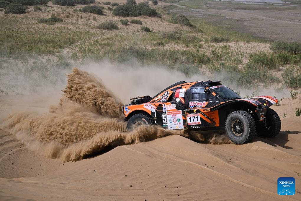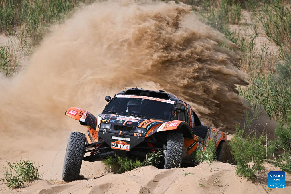 Driver Lin Jie and co-driver Wang Zhiqiang of China compete during Stage 6 of the 2025 Taklimakan Rally in Hetian, northwest China's Xinjiang Uygur Autonomous Region, May 27, 2025. (Xinhua/Xin Yuewei)
