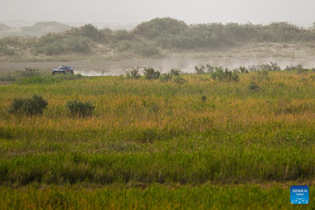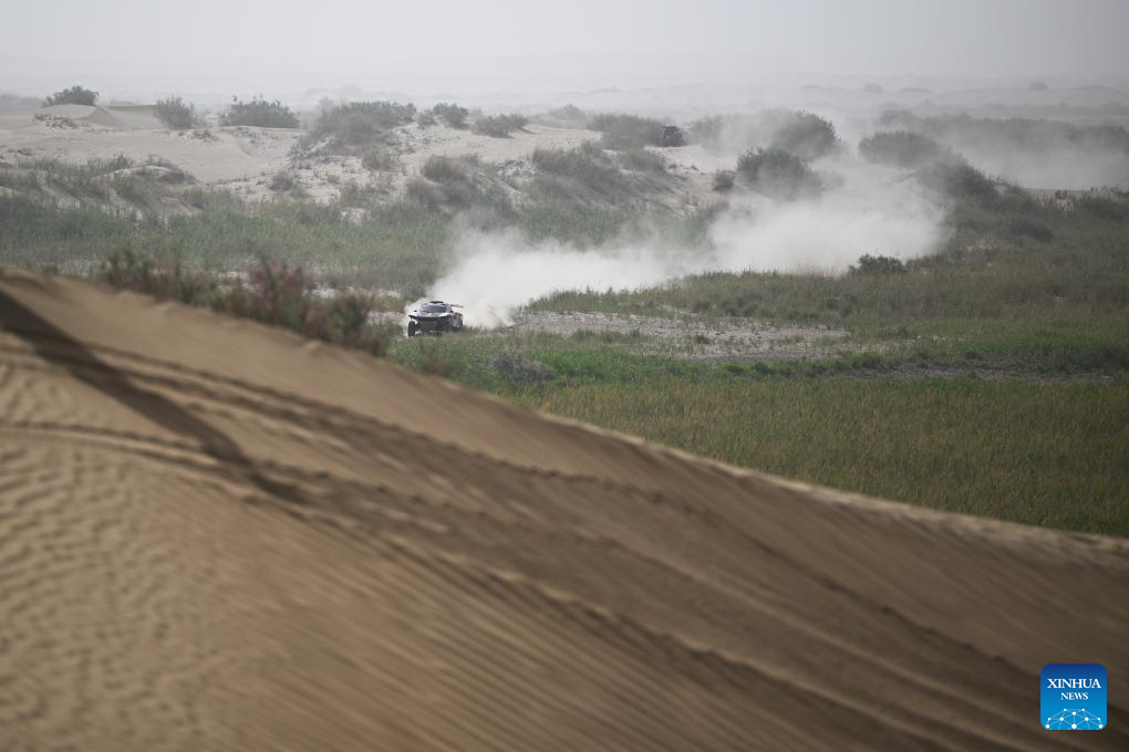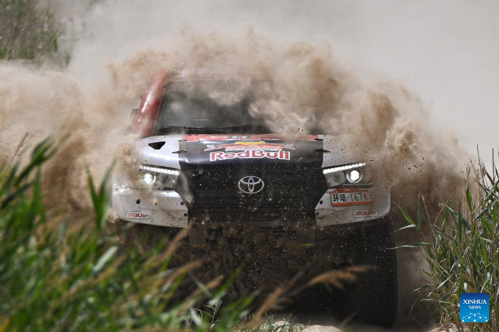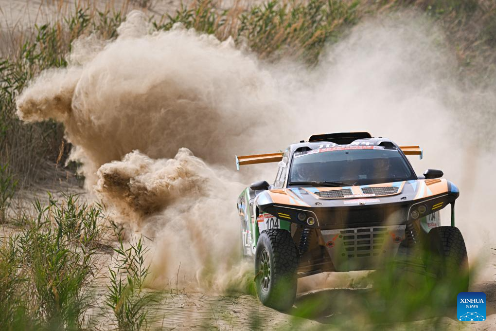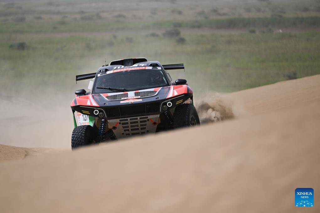 Driver Lin Jie and co-driver Wang Zhiqiang of China compete during Stage 6 of the 2025 Taklimakan Rally in Hetian, northwest China's Xinjiang Uygur Autonomous Region, May 27, 2025. (Xinhua/Xin Yuewei)