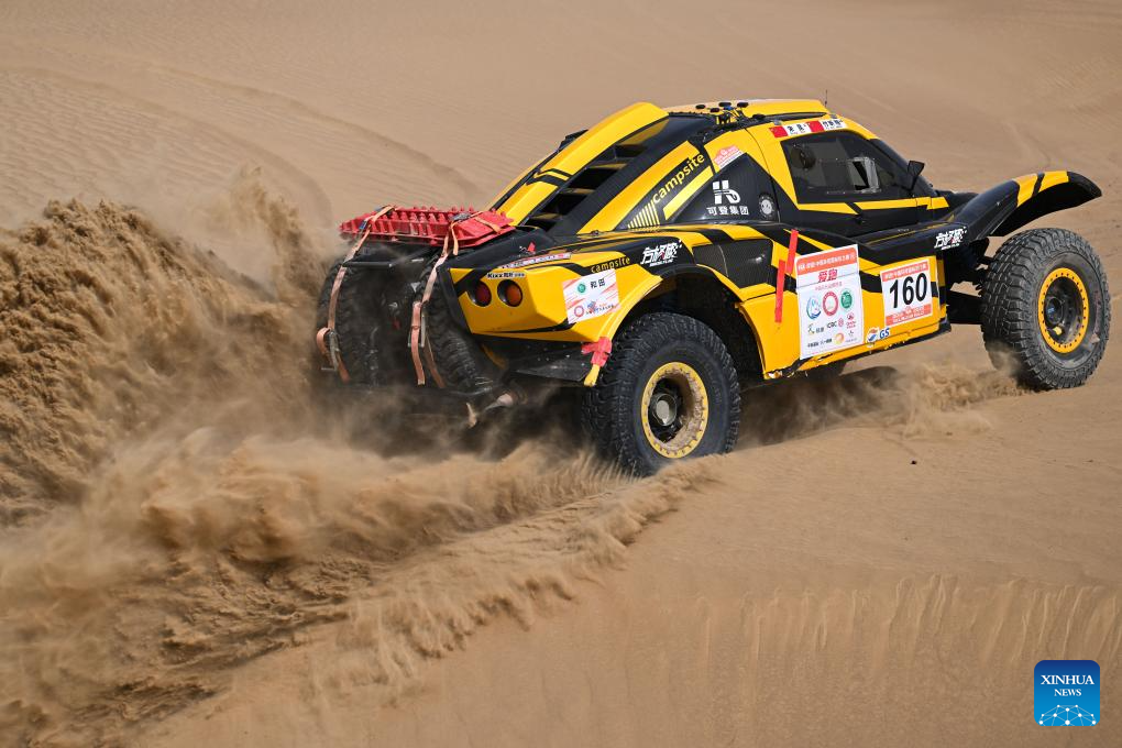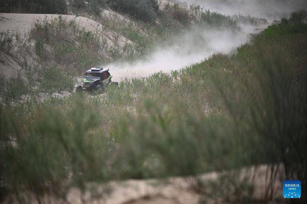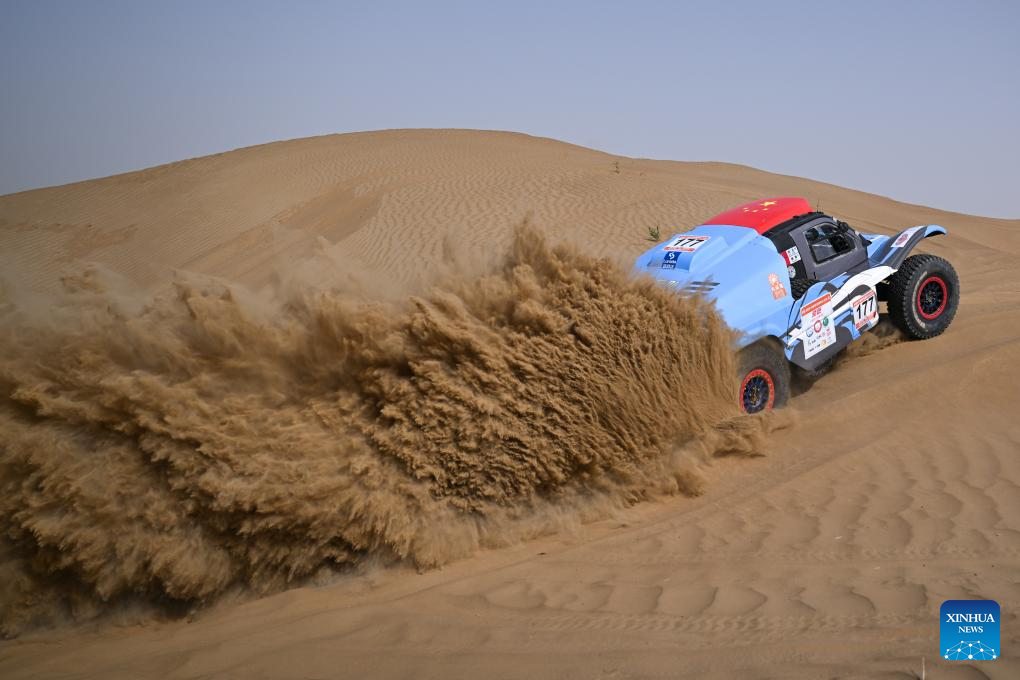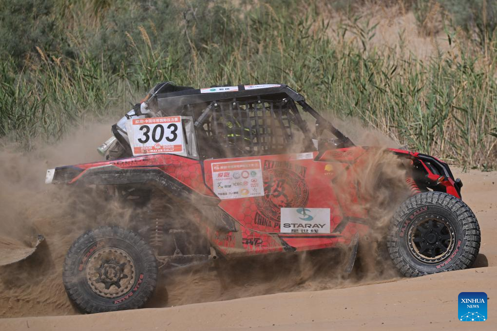 Driver Ou Zhibin and co-driver Zhao Kai of China compete during Stage 6 of the 2025 Taklimakan Rally in Hetian, northwest China's Xinjiang Uygur Autonomous Region, May 27, 2025. (Xinhua/Xin Yuewei)