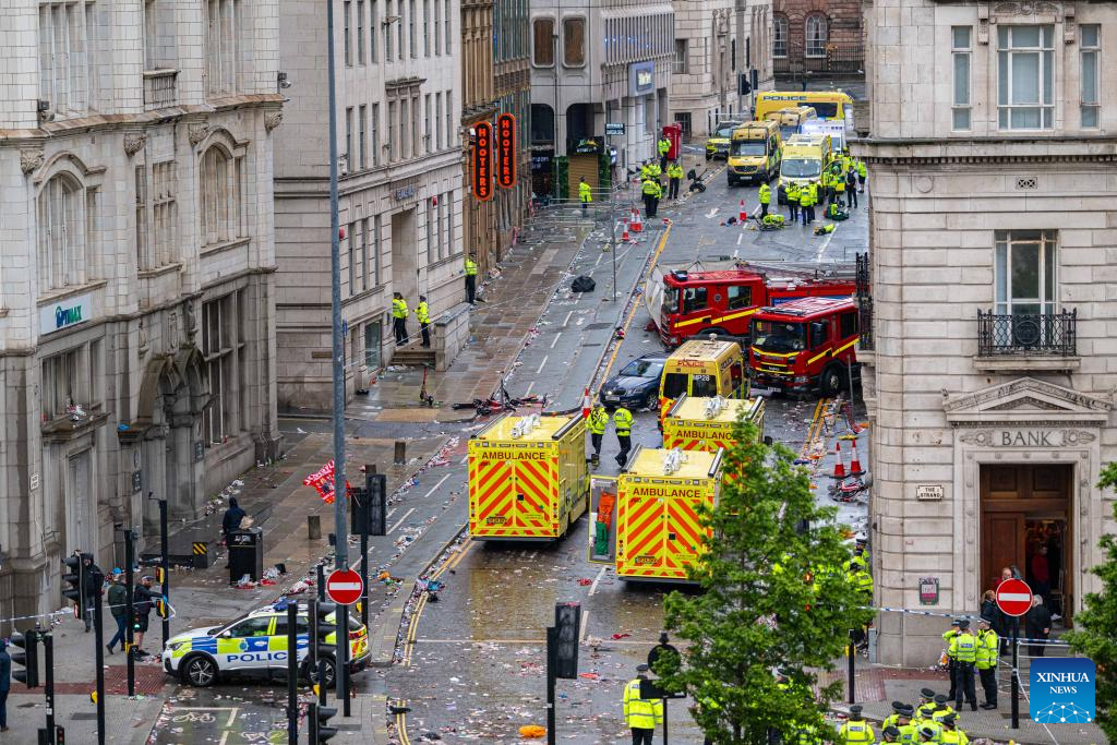 Police officers and emergency workers are pictured on the scene of an incident in which a car ploughed into a crowd celebrating Liverpool Football Club's Premier League victory in Liverpool, Britain, May 26, 2025. A car ploughed into a crowd in Liverpool city center on Monday as thousands of people gathered to celebrate Liverpool Football Club's Premier League victory. The vehicle was quickly stopped at the scene, and a male suspect was taken into custody.