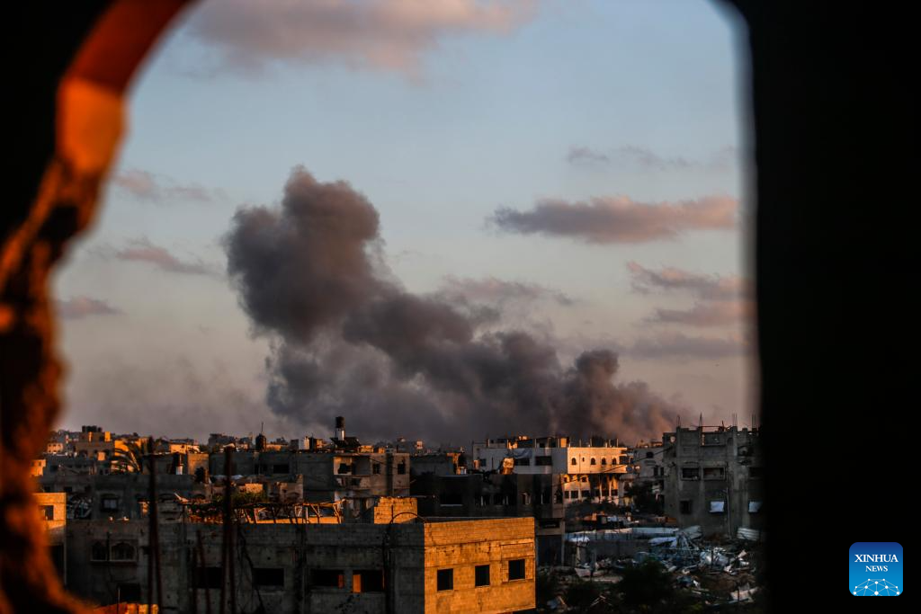 Smoke rises following an Israeli airstrike in Jabalia refugee camp, northern Gaza Strip, on May 27, 2025. (Photo by Mahmoud Zaki/Xinhua)