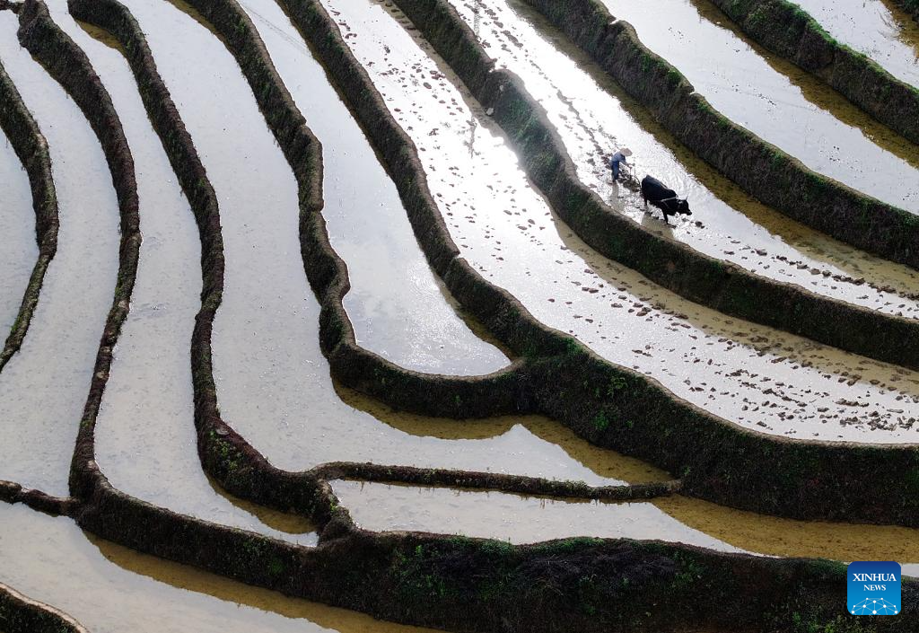 An aerial drone photo taken on May 27, 2025 shows a villager driving an ox to plough the fields in Lixi Village, Dehua County, southeast China's Fujian Province. (Photo by Zhang Jiuqiang/Xinhua)