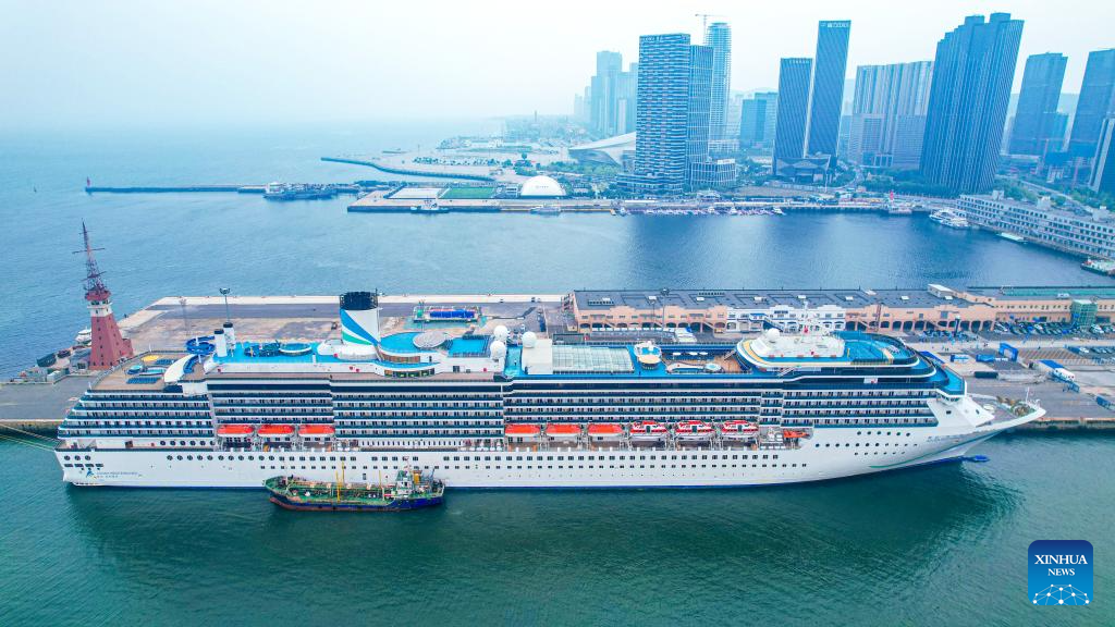An aerial drone photo taken on May 27, 2025 shows cruise ship Adora Mediterranea docking at a port in Dalian, northeast China's Liaoning Province. International cruise ship Adora Mediterranea departed from the northeastern Chinese port city of Dalian on Tuesday evening, marking the port's resumption of international cruise homeport departures following a five-year hiatus. (Xinhua/Pan Yulong)