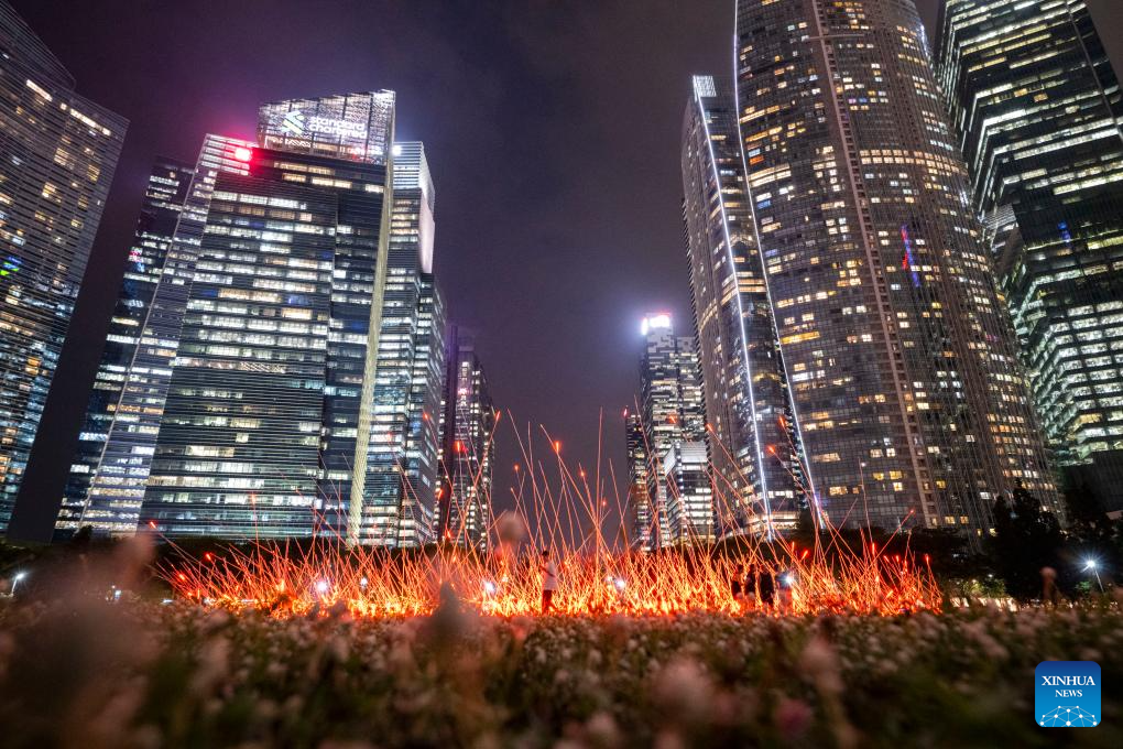 People view a light installation during the preview of "i Light Singapore" light show in Singapore's Marina Bay area on May 27, 2025. The show will be held from May 29 to June 21. (Xinhua/Then Chih Wey)
