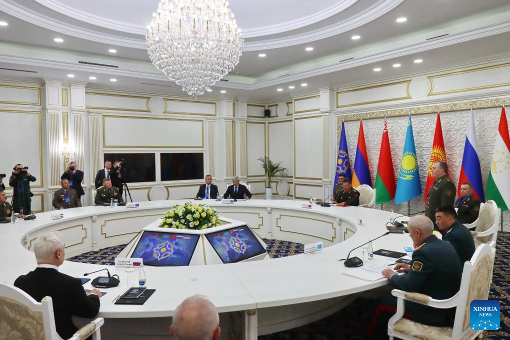 This photo taken on May 28, 2025 shows a meeting of the Defense Ministers Council of the Collective Security Treaty Organization (CSTO) member states in Bishkek, Kyrgyzstan. A meeting of the Defense Ministers Council of the CSTO member states was held here Wednesday, said the press service of the Kyrgyz defense ministry.