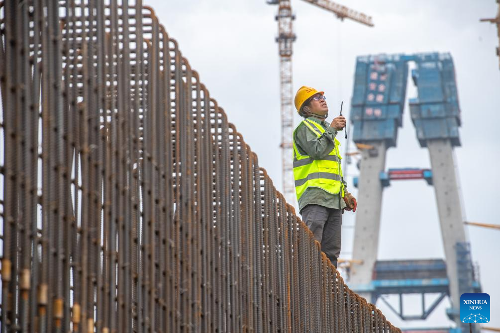 A staff member works at the construction site of Shituo Yangtze River Bridge along the Chongqing-Wanzhou high-speed railway in Chongqing, southwest China, May 28, 2025. With a height of 234.9 meters, the north main tower of the 1,056-meter bridge was successfully capped on Wednesday. (Xinhua/Tang Yi)