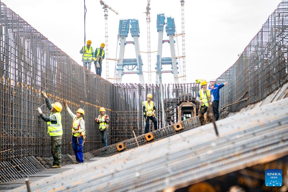 Staff members work at the construction site of Shituo Yangtze River Bridge along the Chongqing-Wanzhou high-speed railway in Chongqing, southwest China, May 28, 2025. With a height of 234.9 meters, the north main tower of the 1,056-meter bridge was successfully capped on Wednesday. (Xinhua/Tang Yi)