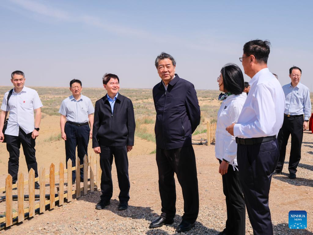 Chinese Vice Premier He Lifeng, also a member of the Political Bureau of the Communist Party of China Central Committee, visits the site of a quicksand control project along the Yellow River in north China's Inner Mongolia Autonomous Region, May 27, 2025. He on Tuesday attended a meeting on advancing desertification control for the meandering bends of the Yellow River in Bayannur, north China's Inner Mongolia Autonomous Region. (Xinhua/Ma Jinrui)
