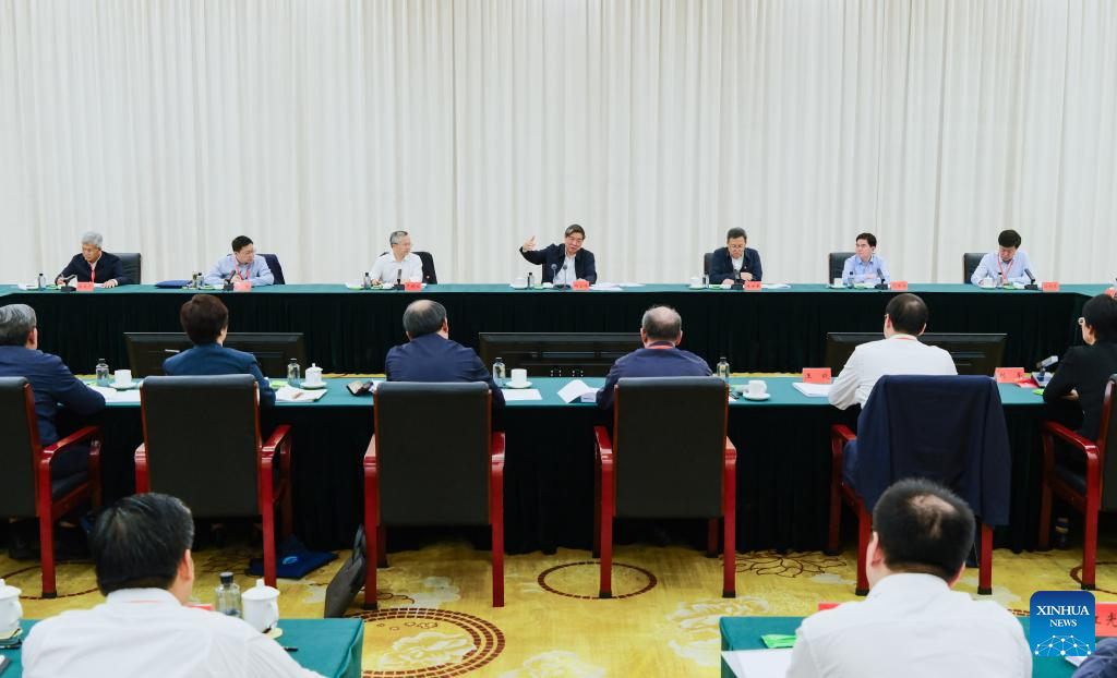 Chinese Vice Premier He Lifeng, also a member of the Political Bureau of the Communist Party of China Central Committee, addresses a meeting on advancing desertification control for the meandering bends of the Yellow River in Bayannur, north China's Inner Mongolia Autonomous Region, May 27, 2025. (Xinhua/Ma Jinrui)