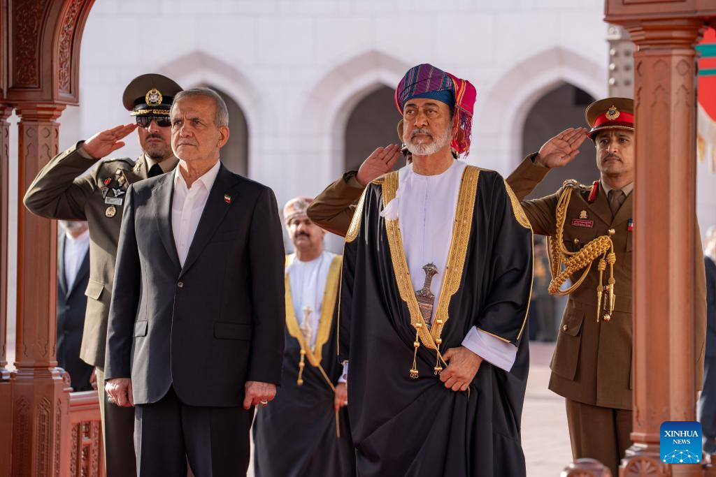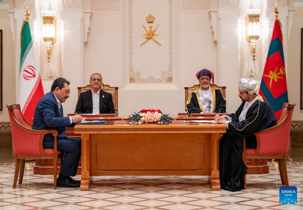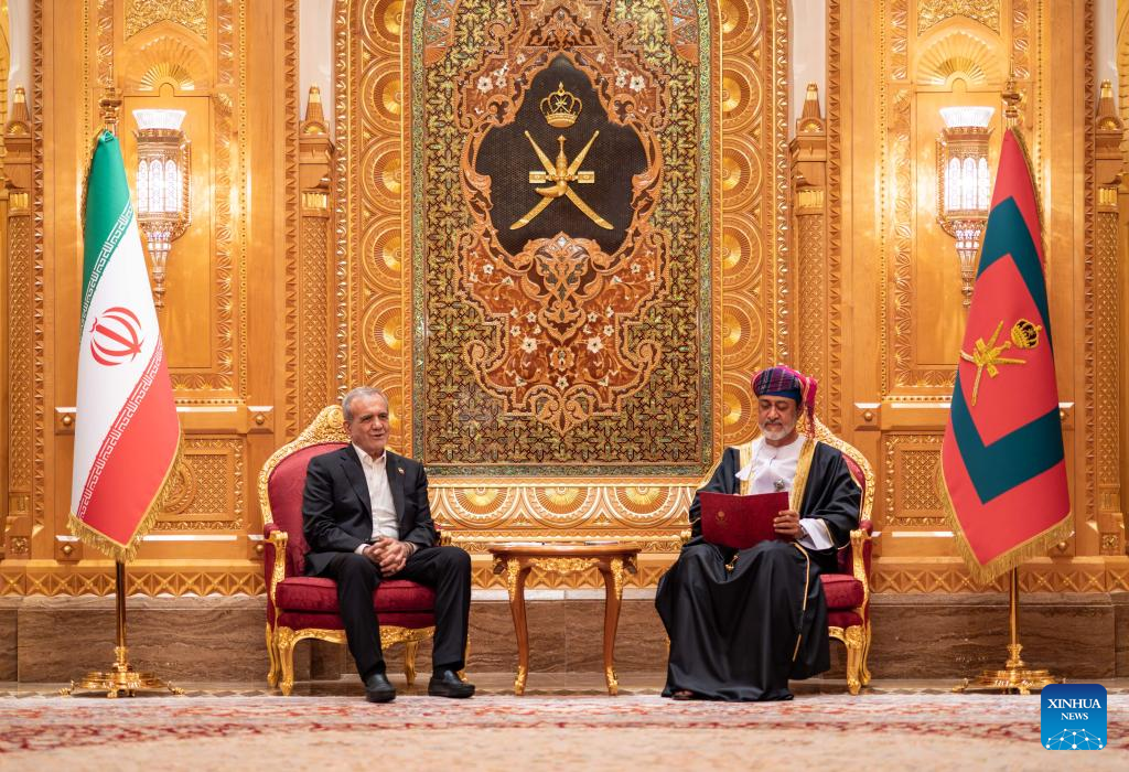MUSCAT, May 27 (Xinhua) -- Iranian President Masoud Pezeshkian began a two-day official visit to Oman on Tuesday, meeting Sultan Haitham bin Tariq Al Said and overseeing the signing of a series of bilateral agreements, as Muscat continues its role as a mediator in indirect nuclear talks between Tehran and Washington.