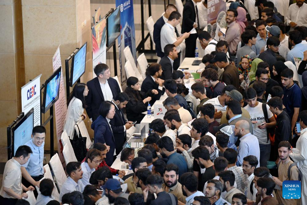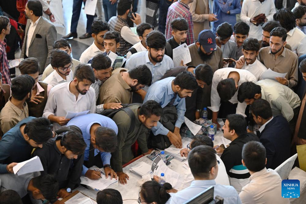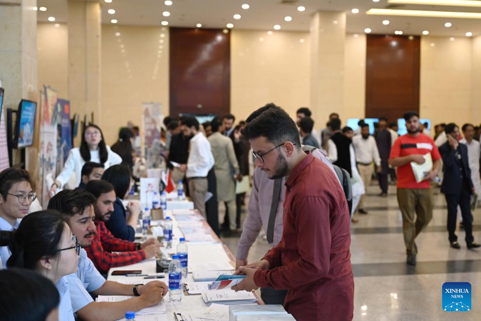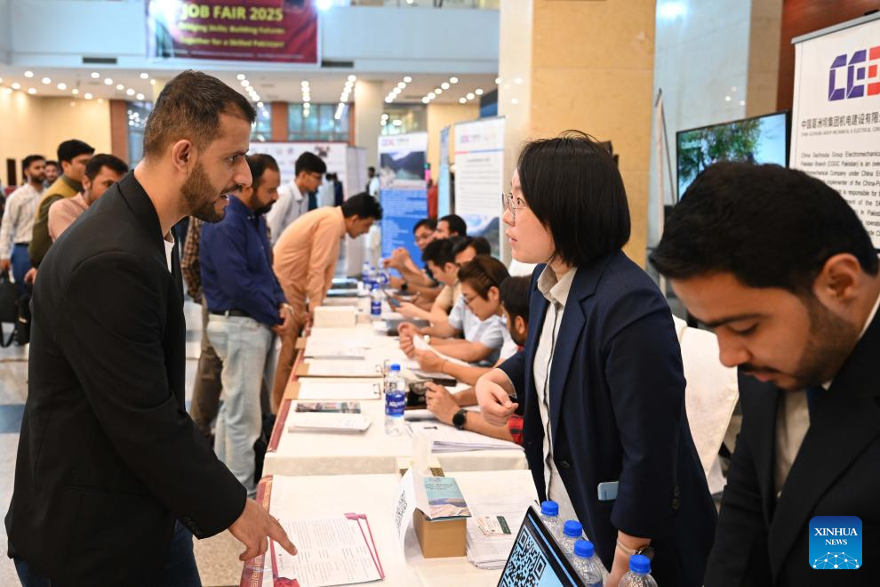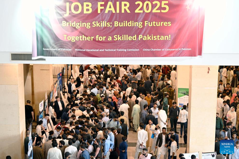 People attend a job fair in Islamabad, Pakistan, on May 27, 2025. Jointly organized by the China Chamber of Commerce in Pakistan (CCCP) and the National Vocational and Technical Training Commission (NAVTTC) of Pakistan, the event brought together 20 leading Chinese companies offering positions across various sectors, including engineering, project management, finance, skilled trades, and administrative roles. (Xinhua/Ahmad Kamal)