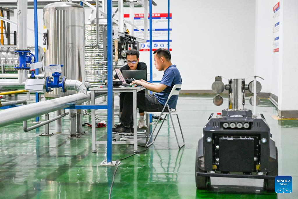 Technicians debug an explosion-proof wheeled robot at Sevnce Robotics in southwest China's Chongqing Municipality, May 27, 2025. In recent years, Chongqing has taken multiple measures to promote the development of robot industry. Now it has formed a whole robot industry chain covering R&D, complete machine manufacturing, testing, system integration, parts matching, talent training and application services.