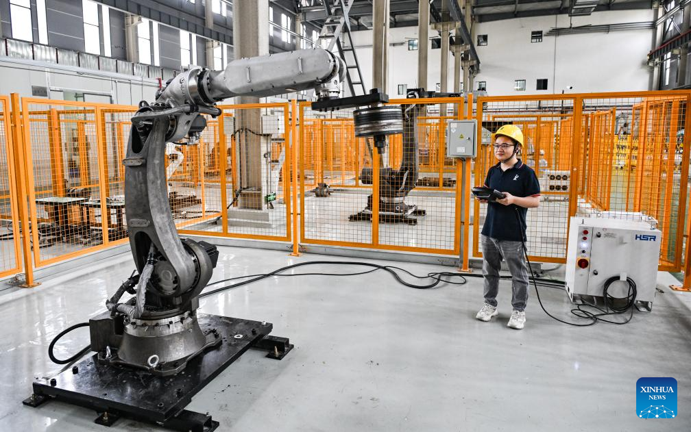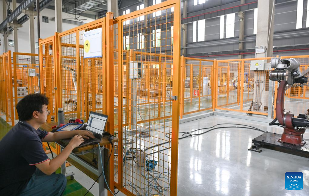 A technician debugs an industrial robot at Huashu Robot in southwest China's Chongqing Municipality, May 15, 2025. In recent years, Chongqing has taken multiple measures to promote the development of robot industry. Now it has formed a whole robot industry chain covering R&D, complete machine manufacturing, testing, system integration, parts matching, talent training and application services.