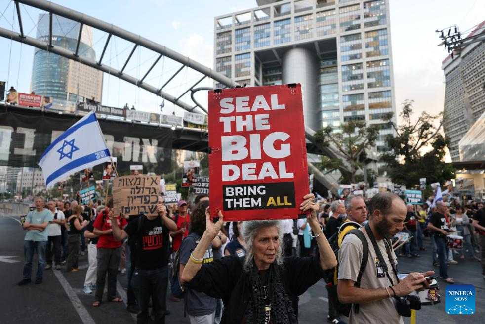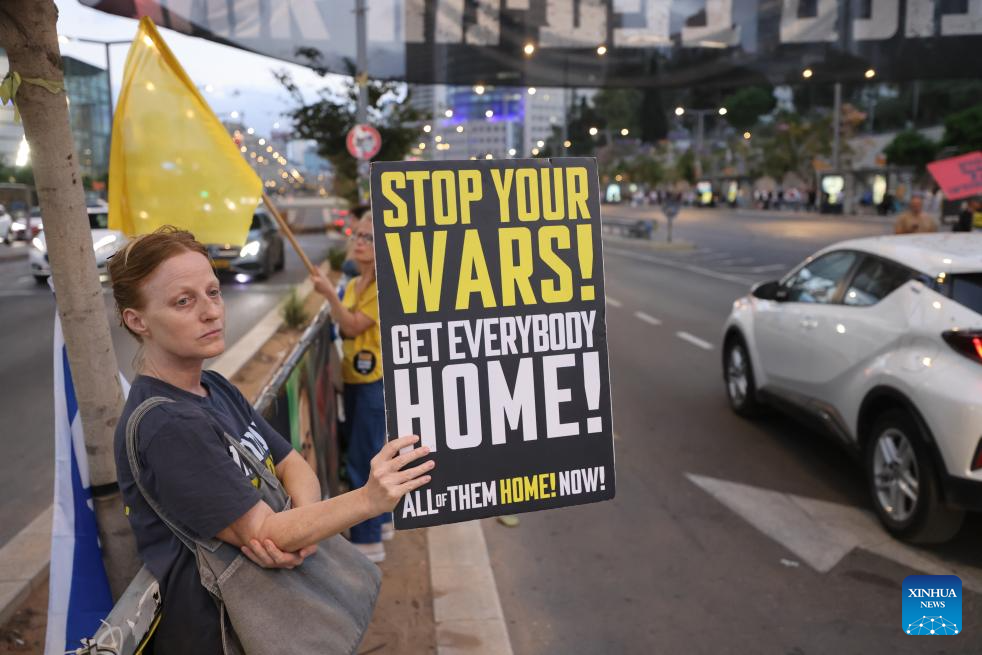 People attend a demonstration in Tel Aviv, Israel, May 28, 2025. The demonstration called for a permanent ceasefire in Gaza and a deal with Hamas to secure the release of hostages, as the new round of the Israel-Palestine conflict reached its 600th day. (Photo by Jamal Awad/Xinhua)
