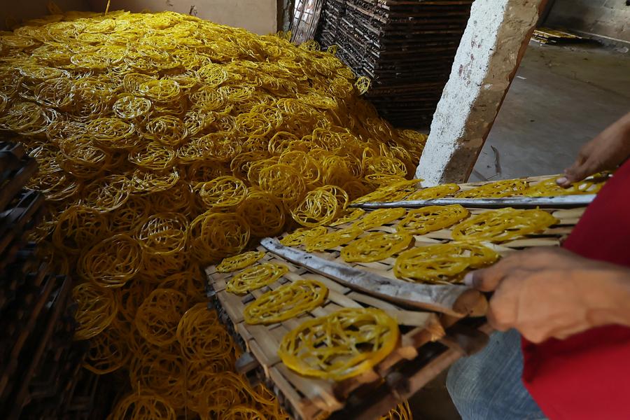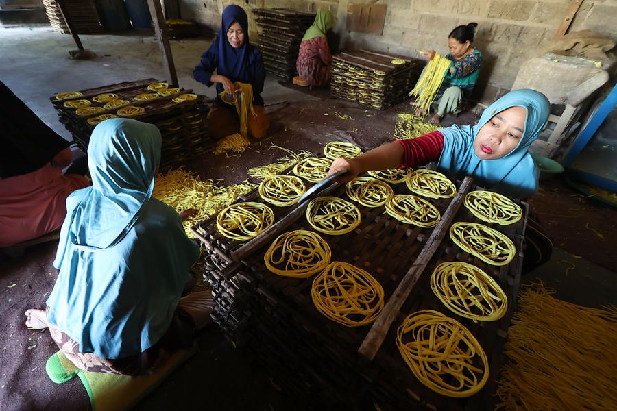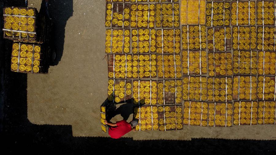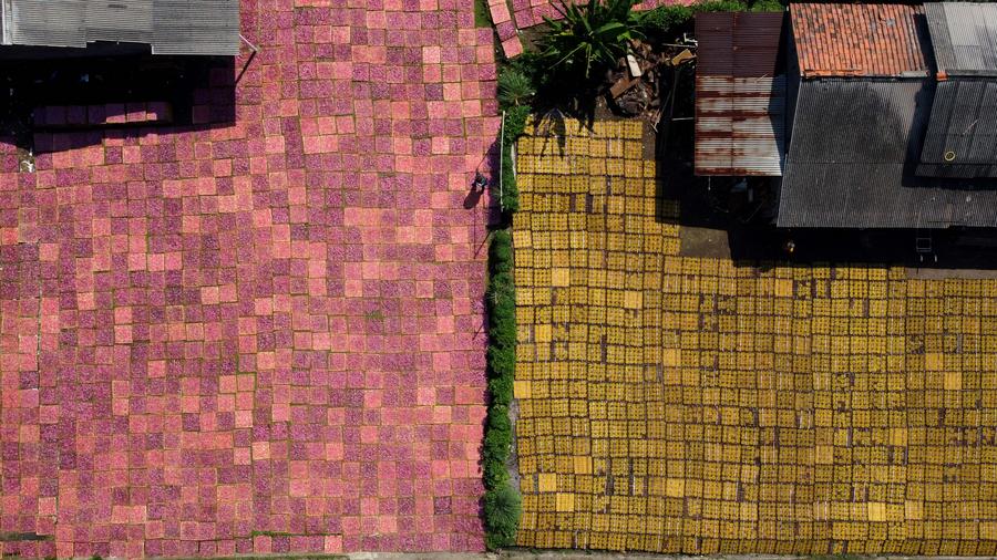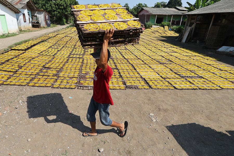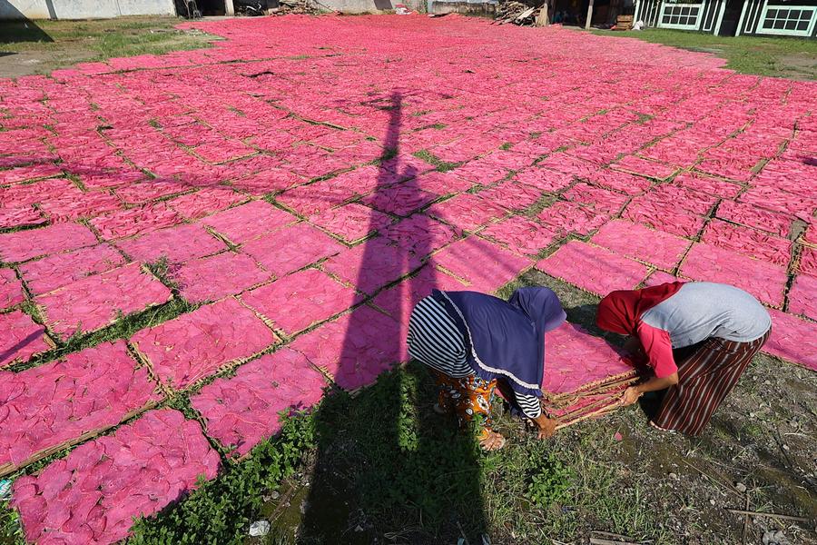 Workers arrange traditional red crackers on bamboo plates before drying them at a home-based workshop in Karadenan village, Bogor Regency, West Java, Indonesia, May 28, 2025. (Photo by Yorri Farli/Xinhua)An aerial drone photo shows a worker arranging traditional yellow crackers on bamboo plates before drying them at a home-based workshop in Karadenan village, Bogor Regency, West Java, Indonesia, May 28, 2025. (Photo by Yorri Farli/Xinhua)A worker carries traditional yellow crackers on bamboo plates before drying them at a home-based workshop in Karadenan village, Bogor Regency, West Java, Indonesia, May 28, 2025. (Photo by Yorri Farli/Xinhua)A worker slides traditional yellow crackers off a bamboo plate after drying them at a home-based workshop in Karadenan village, Bogor Regency, West Java, Indonesia, May 28, 2025. (Photo by Yorri Farli/Xinhua)Workers make traditional yellow crackers at a home-based workshop in Karadenan village, Bogor Regency, West Java, Indonesia, May 28, 2025. (Photo by Yorri Farli/Xinhua)■