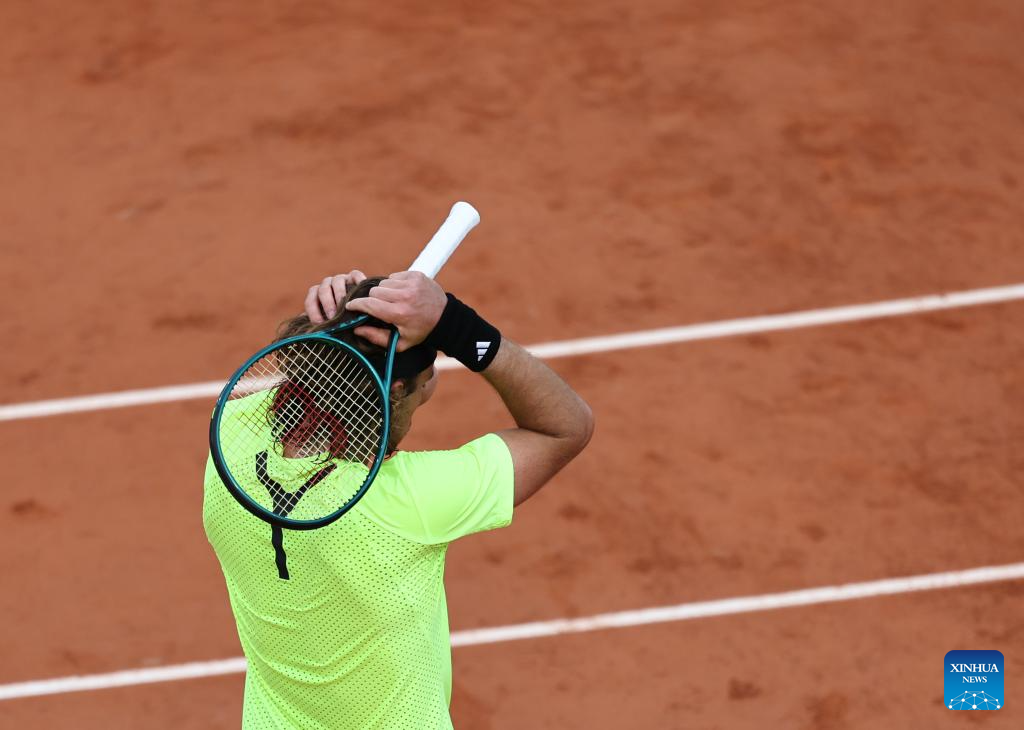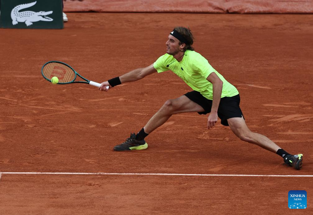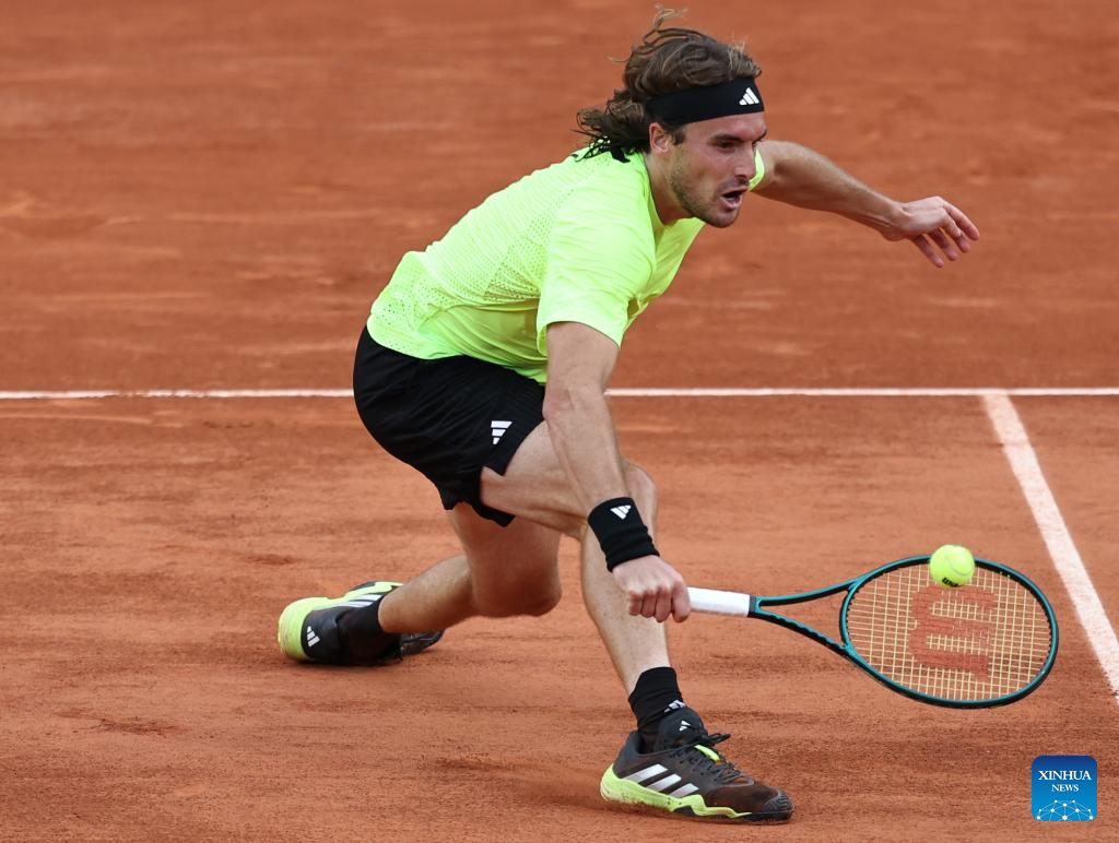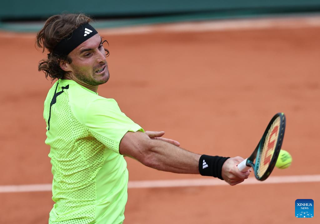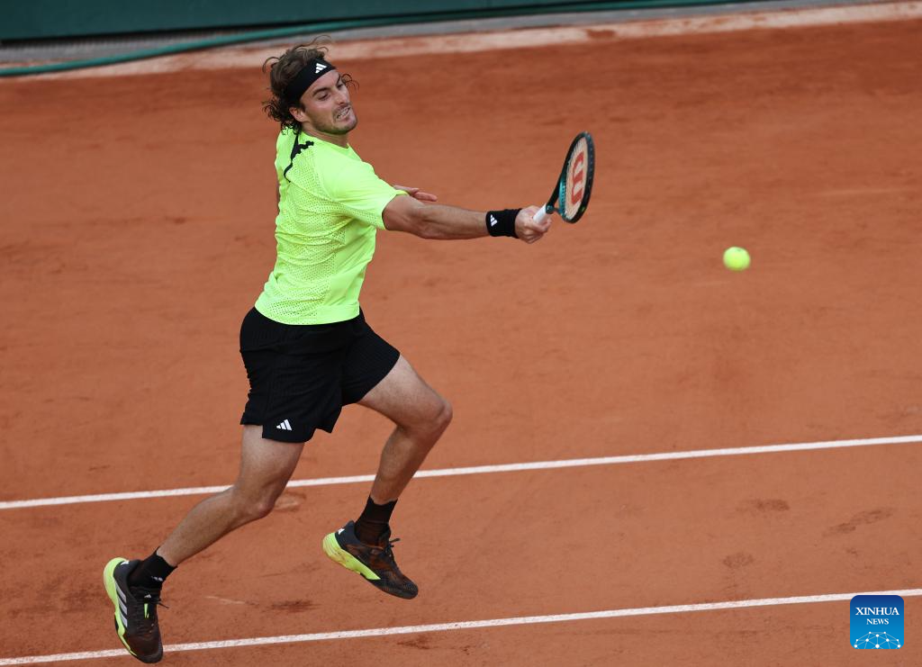 Stefanos Tsitsipas returns a shot during the men's singles 2nd round match between Matteo Gigante of Italy and Stefanos Tsitsipas of Greece at the French Open tennis tournament at Roland Garros, Paris, France, May 28, 2025. (Xinhua/Li Jing)
