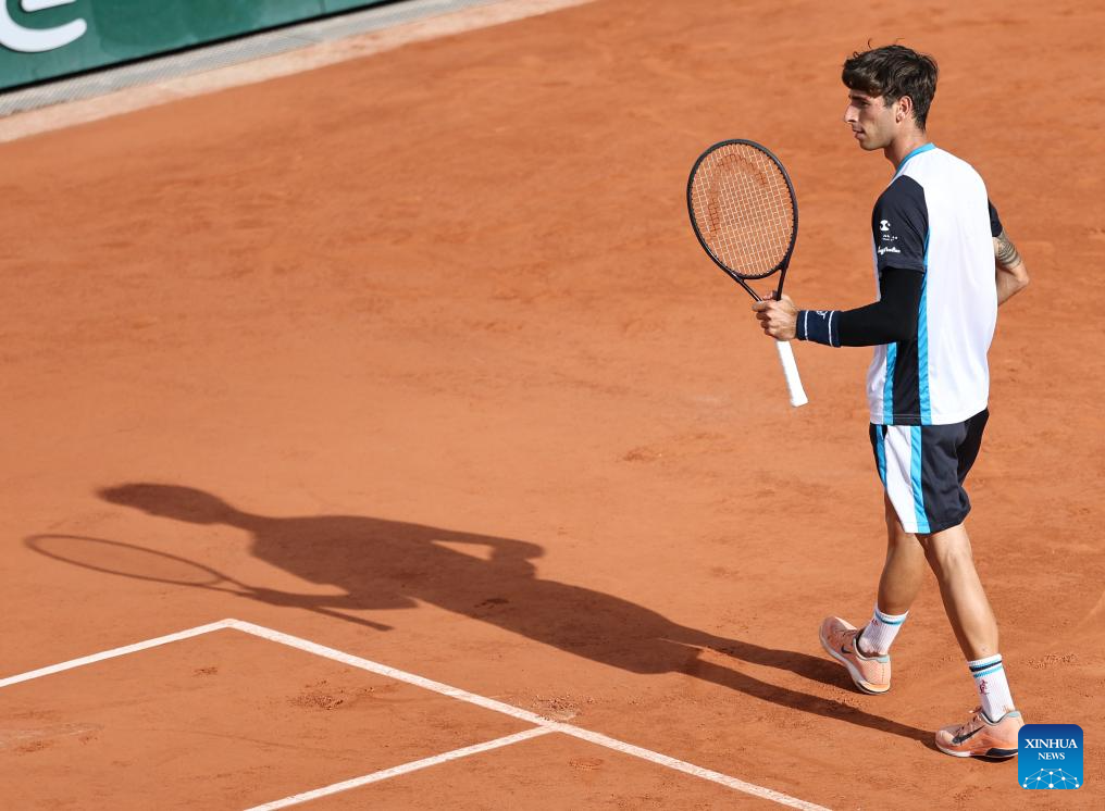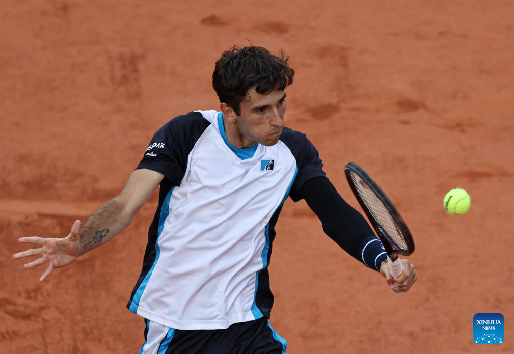 Matteo Gigante returns a shot during the men's singles 2nd round match between Matteo Gigante of Italy and Stefanos Tsitsipas of Greece at the French Open tennis tournament at Roland Garros, Paris, France, May 28, 2025. (Xinhua/Li Jing)