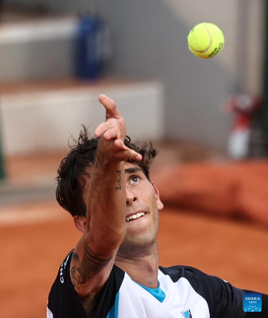 Matteo Gigante serves during the men's singles 2nd round match between Matteo Gigante of Italy and Stefanos Tsitsipas of Greece at the French Open tennis tournament at Roland Garros, Paris, France, May 28, 2025. (Xinhua/Li Jing)