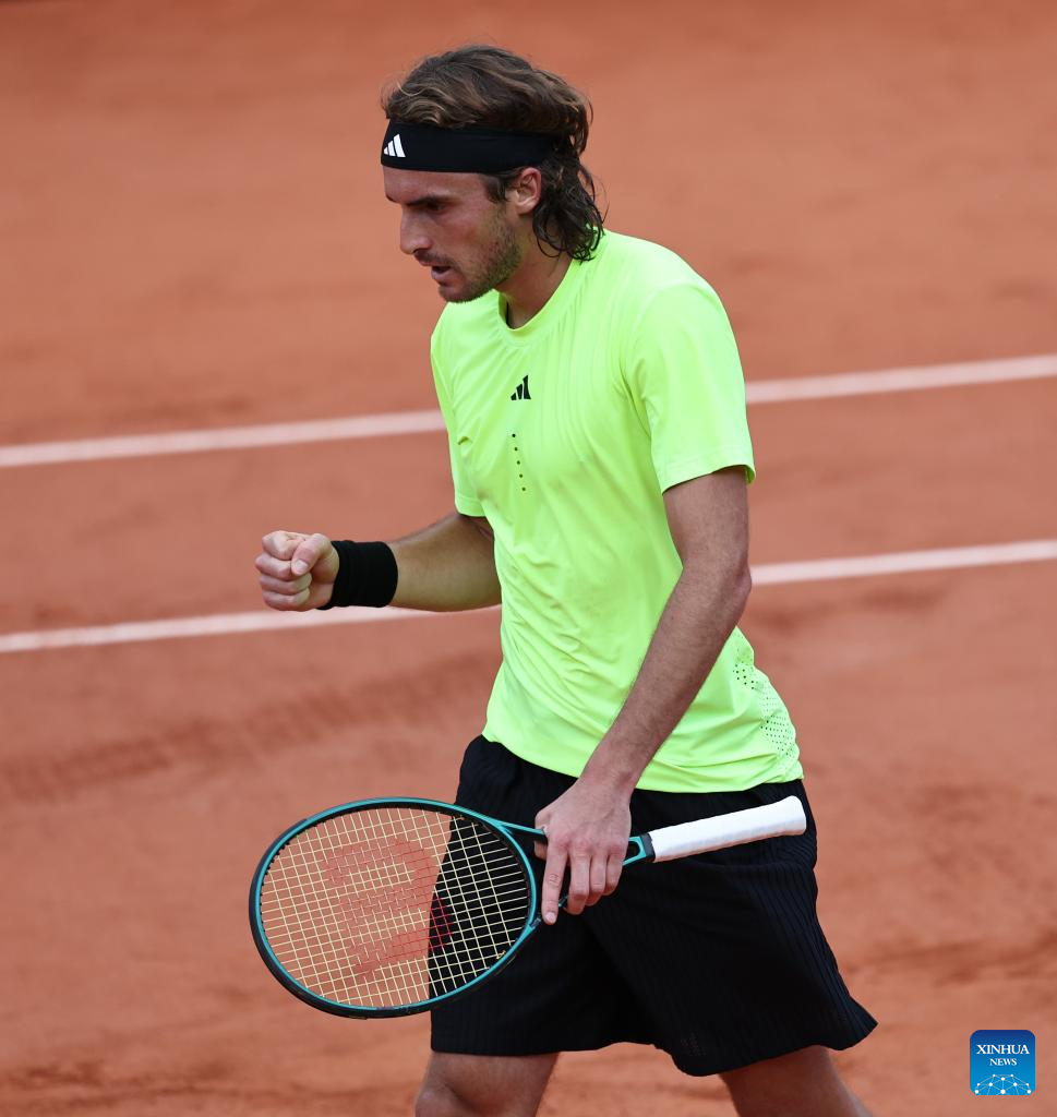 Stefanos Tsitsipas celebrates after winning a point during the men's singles 2nd round match between Matteo Gigante of Italy and Stefanos Tsitsipas of Greece at the French Open tennis tournament at Roland Garros, Paris, France, May 28, 2025. (Xinhua/Li Jing)