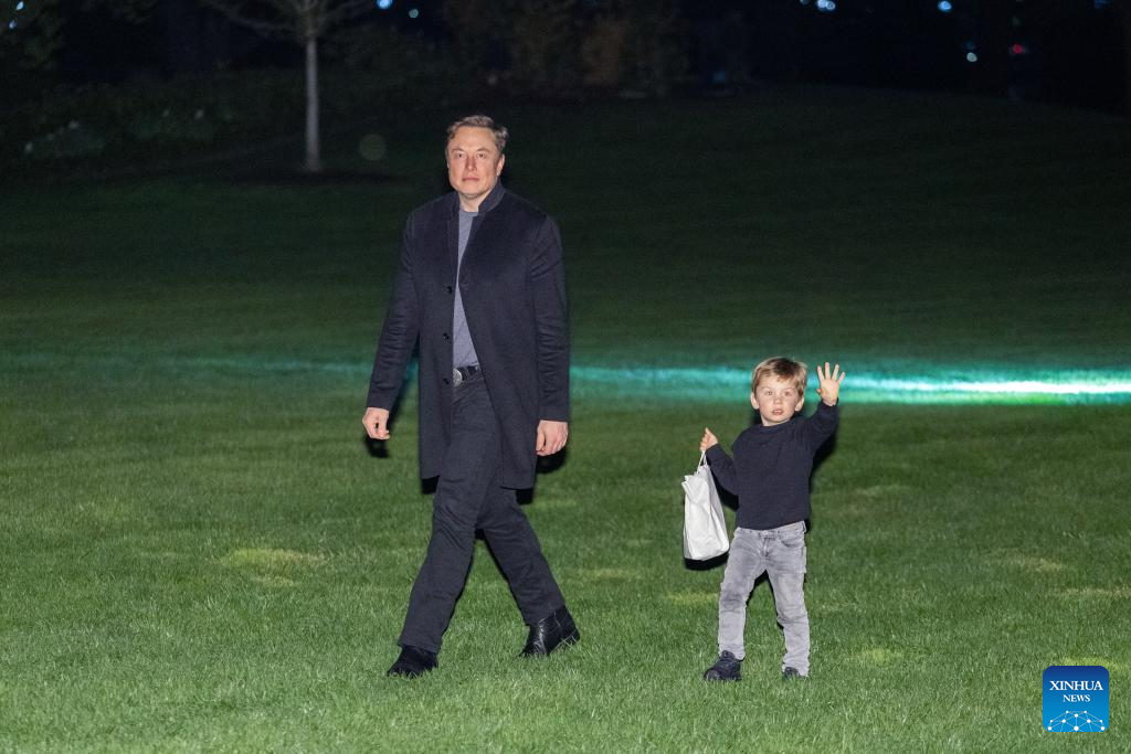 This file photo taken on April 13, 2025 shows Elon Musk and his son walking upon arrival on the South Lawn of the White House in Washington, D.C., the United States. Tesla CEO Elon Musk said on May 28 that he is leaving his government role as an adviser to U.S. President Donald Trump. (Xinhua/Hu Yousong)