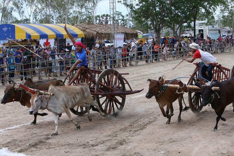 PHETCHABURI, Thailand, May 29 (Xinhua) -- Contestants competed during an ox cart race in Phetchaburi Province of Thailand on Wednesday. Ox cart racing is an annual event held in Phetchaburi to celebrate the end of harvest season.