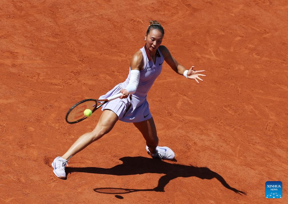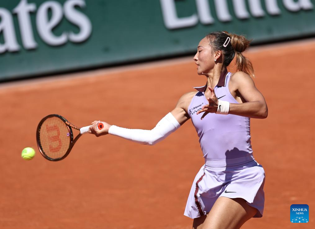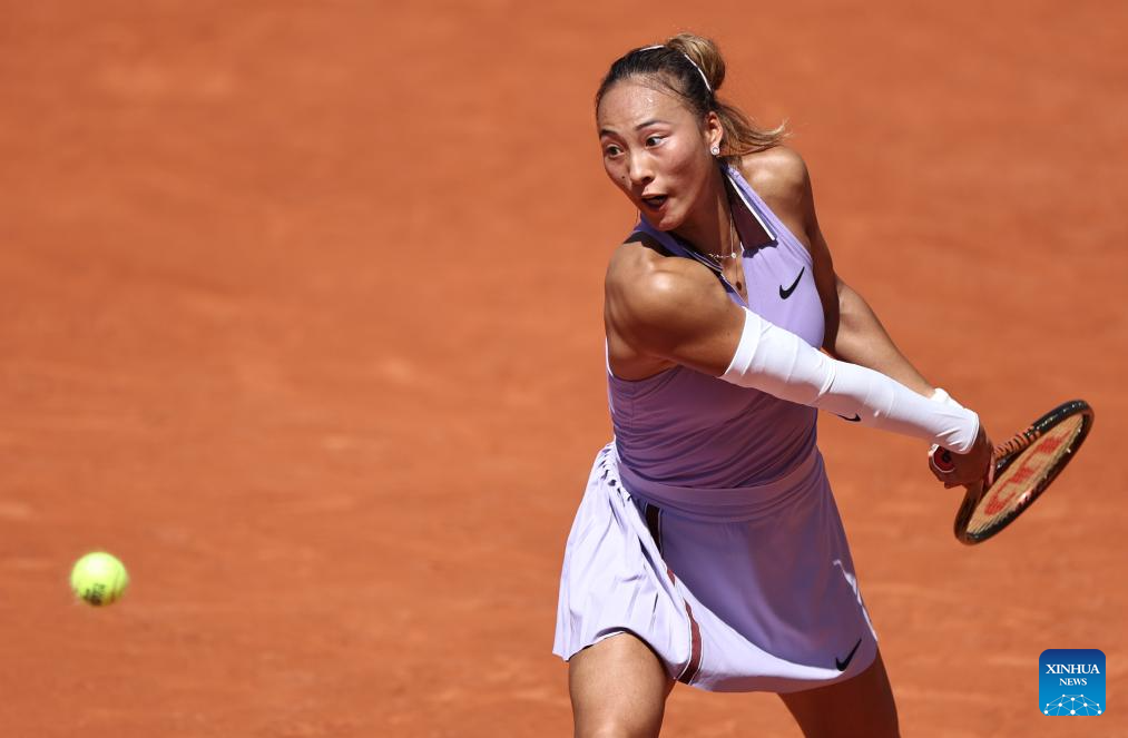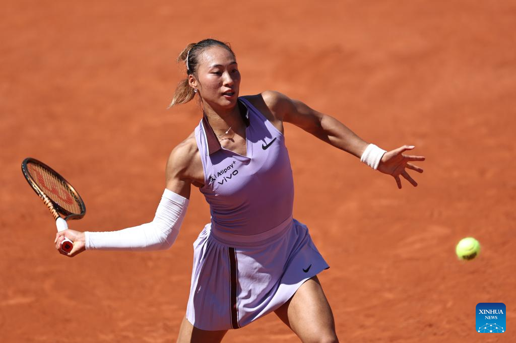Zheng Qinwen returns a shot during the women's singles 3rd round match between Zheng Qinwen of China and Victoria Mboko of Canada at the French Open tennis tournament at Roland Garros, Paris, France, May 30, 2025. (Xinhua/Li Jing)