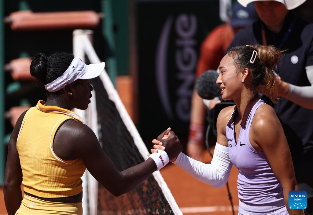 Zheng Qinwen (R) of China greets Victoria Mboko of Canada after the women's singles 3rd round match at the French Open tennis tournament at Roland Garros, Paris, France, May 30, 2025. (Xinhua/Li Jing)