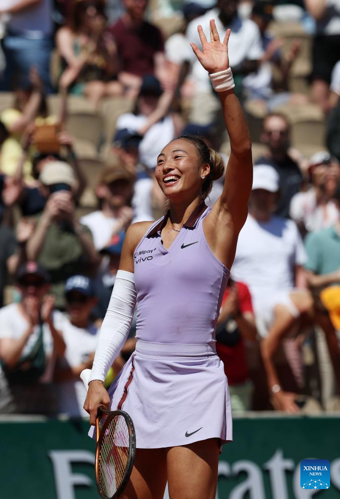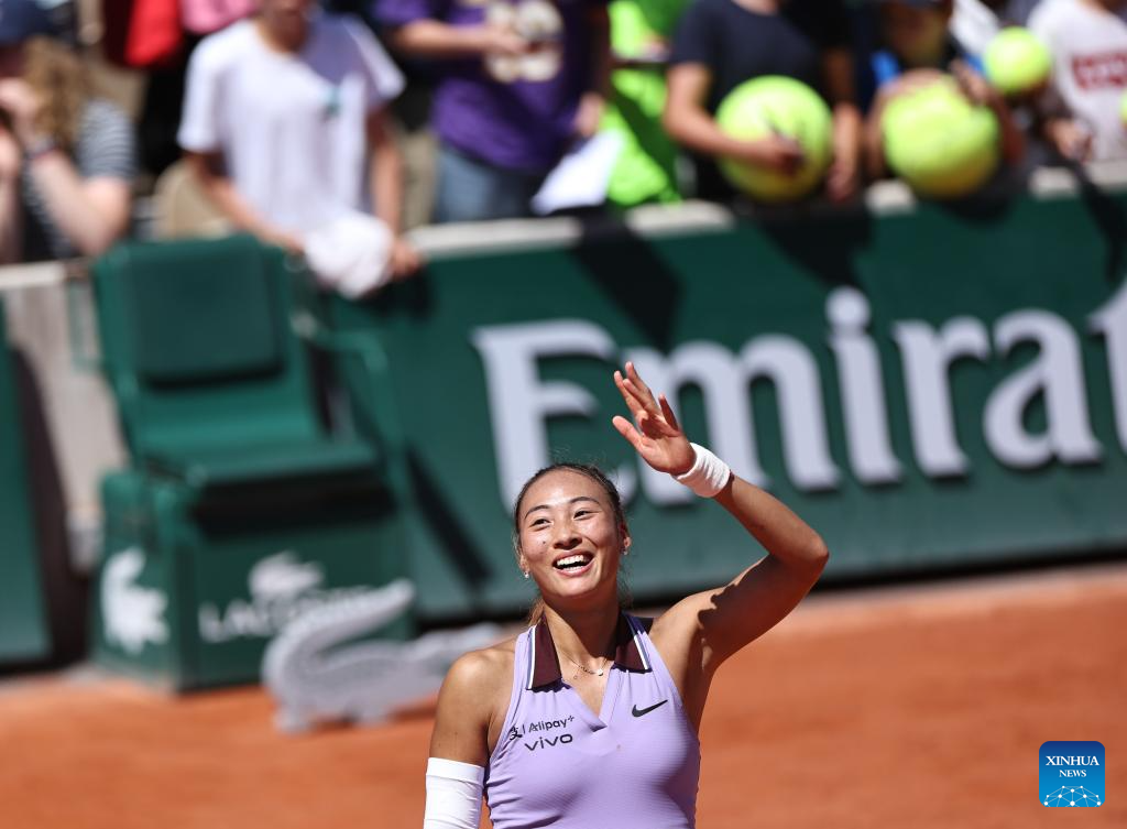 Zheng Qinwen celebrates after the women's singles 3rd round match between Zheng Qinwen of China and Victoria Mboko of Canada at the French Open tennis tournament at Roland Garros, Paris, France, May 30, 2025. (Xinhua/Li Jing)