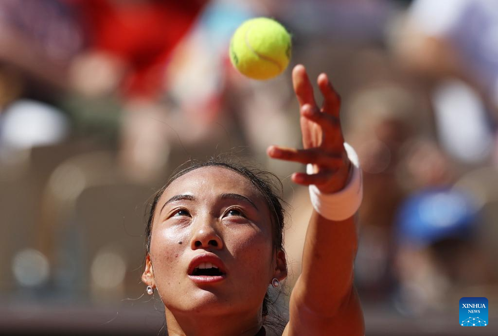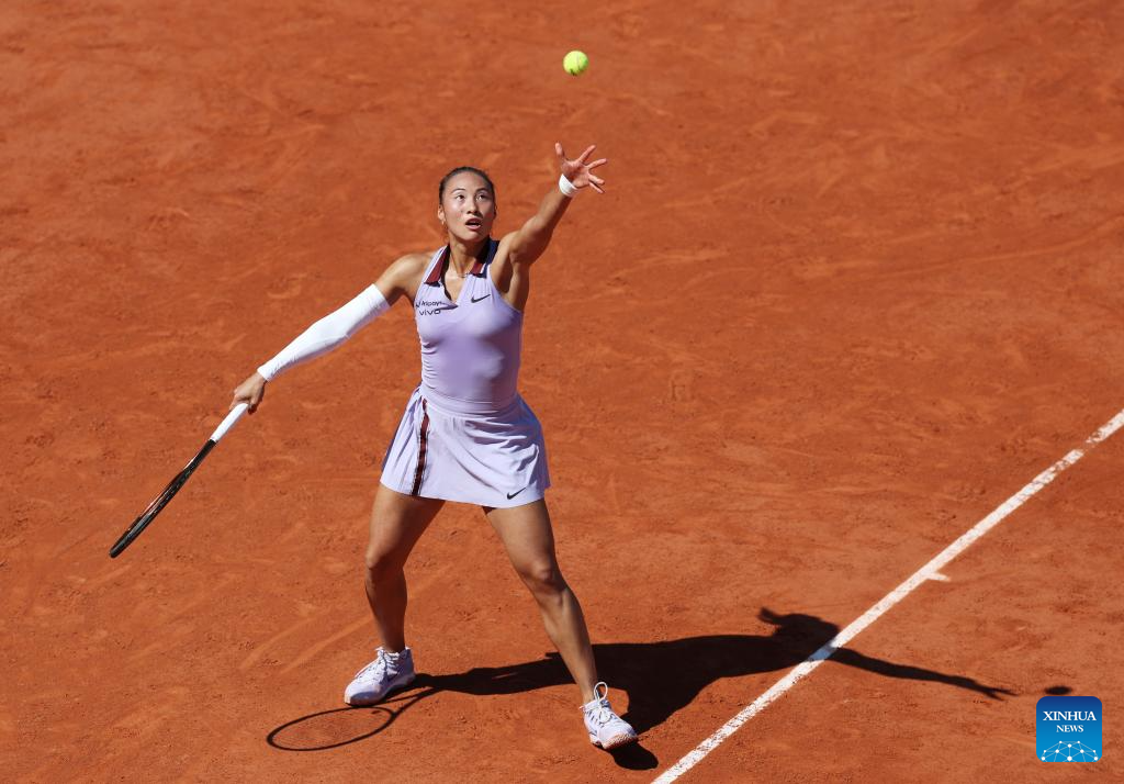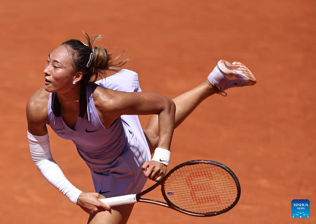 Zheng Qinwen serves during the women's singles 3rd round match between Zheng Qinwen of China and Victoria Mboko of Canada at the French Open tennis tournament at Roland Garros, Paris, France, May 30, 2025. (Xinhua/Li Jing)