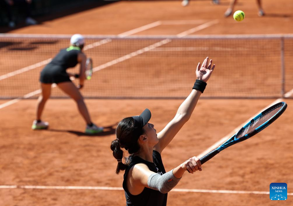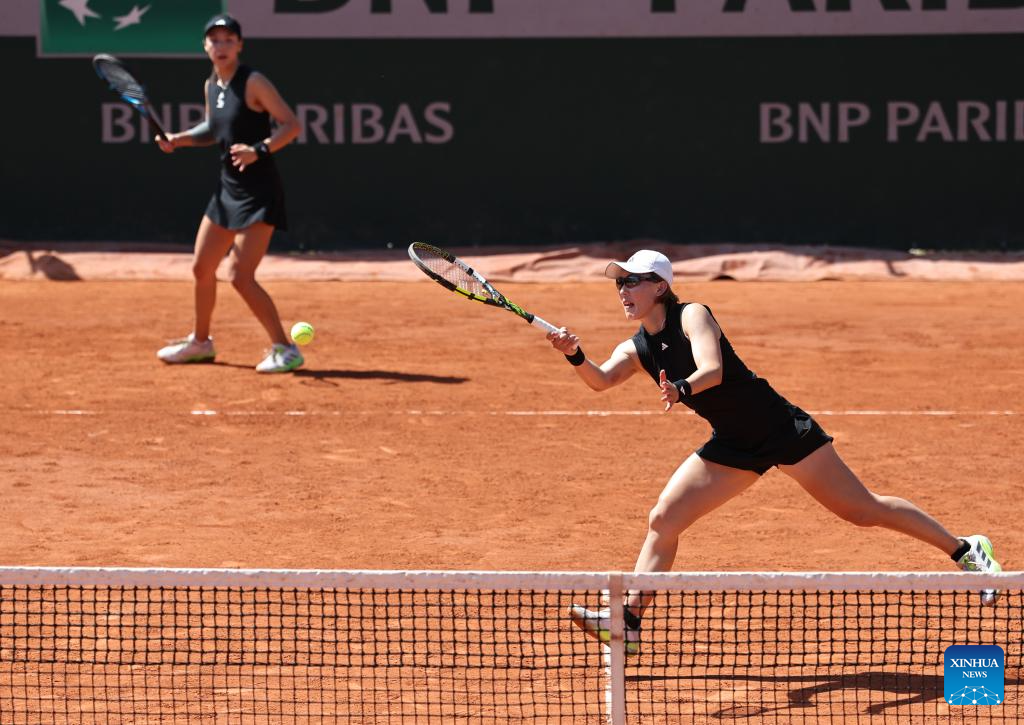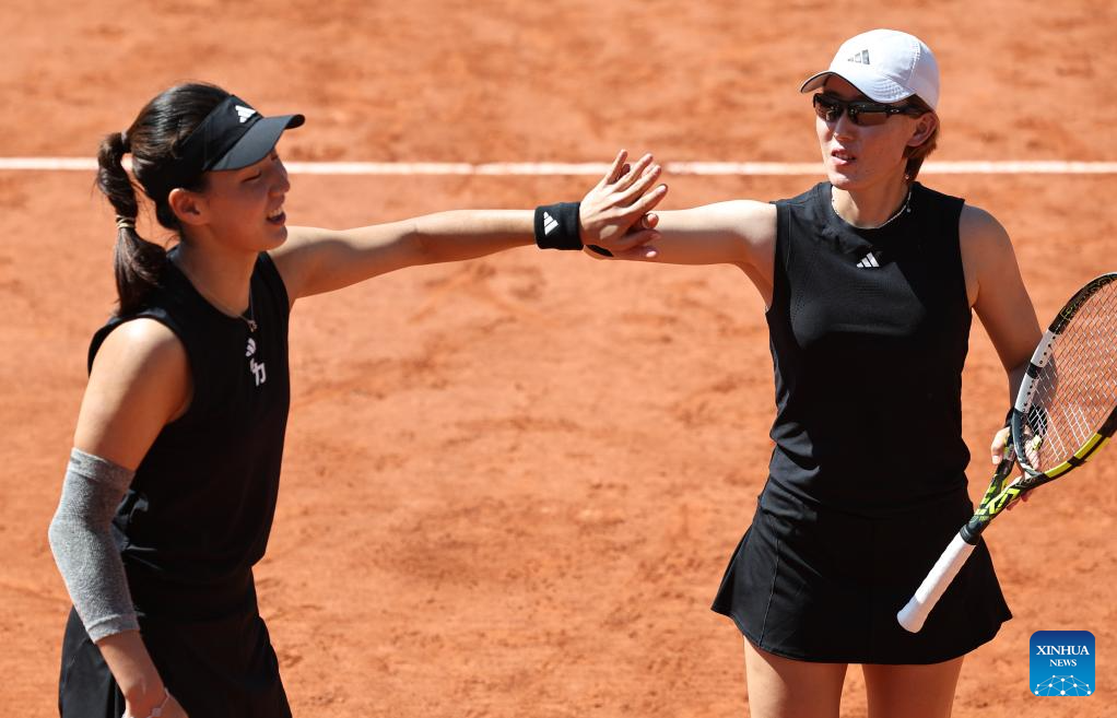 Wang Xinyu (L)/Zheng Saisai compete the women's doubles 2nd round match between Wang Xinyu/Zheng Saisai of China and Ulrikke Eikeri (Norway)/Hozumi Eri (Japan) at the French Open tennis tournament at Roland Garros, Paris, France, May 30, 2025. (Xinhua/Li Jing)
