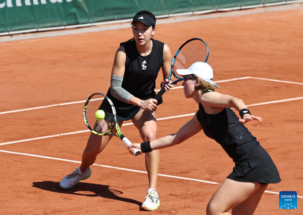 Wang Xinyu (front)/Zheng Saisai compete during the women's doubles 2nd round match between Wang Xinyu/Zheng Saisai of China and Ulrikke Eikeri (Norway)/Hozumi Eri (Japan) at the French Open tennis tournament at Roland Garros, Paris, France, May 30, 2025. (Xinhua/Li Jing)