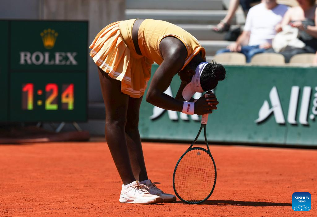 Victoria Mboko reacts during the women's singles 3rd round match between Zheng Qinwen of China and Victoria Mboko of Canada at the French Open tennis tournament at Roland Garros, Paris, France, May 30, 2025. (Xinhua/Gao Jing)