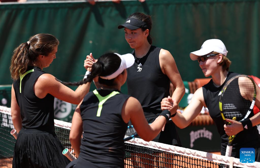 Wang Xinyu (2nd R)/Zheng Saisai (1st R) shake hands with Ulrikke Eikeri (1st L)/Hozumi Eri after the women's doubles 2nd round match between Wang Xinyu/Zheng Saisai of China and Ulrikke Eikeri (Norway)/Hozumi Eri (Japan) at the French Open tennis tournament at Roland Garros, Paris, France, May 30, 2025. (Xinhua/Li Jing)