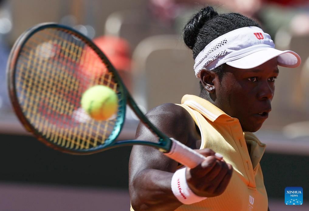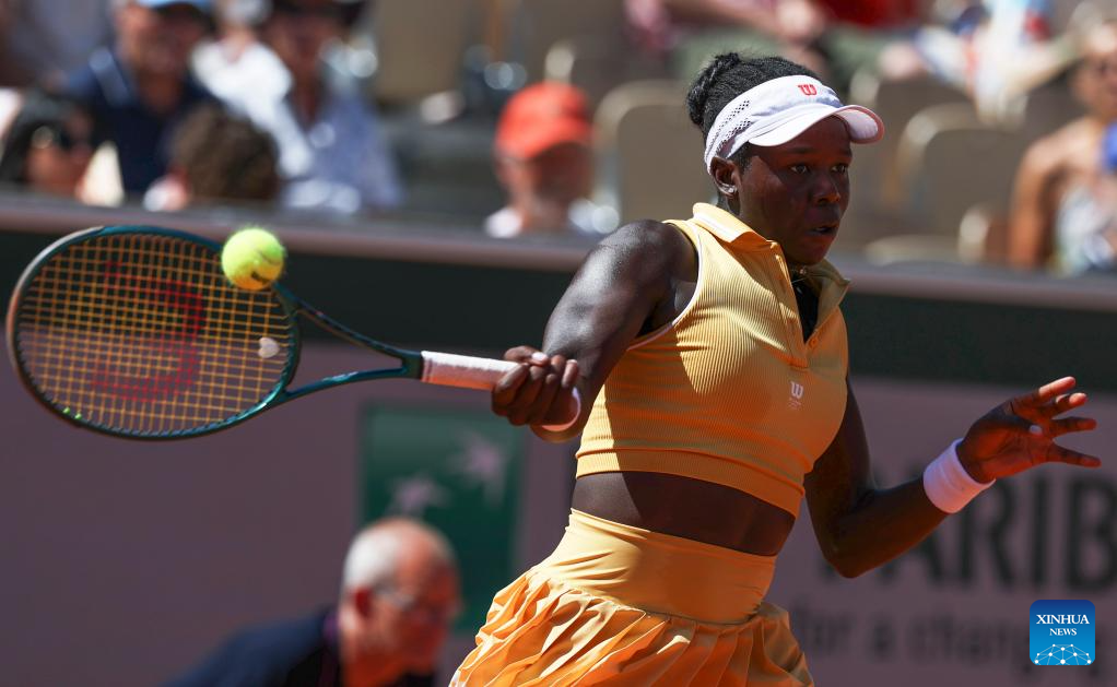 Victoria Mboko returns a shot during the women's singles 3rd round match between Zheng Qinwen of China and Victoria Mboko of Canada at the French Open tennis tournament at Roland Garros, Paris, France, May 30, 2025. (Xinhua/Gao Jing)
