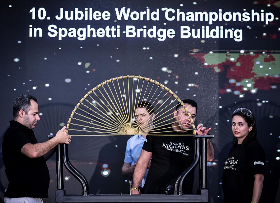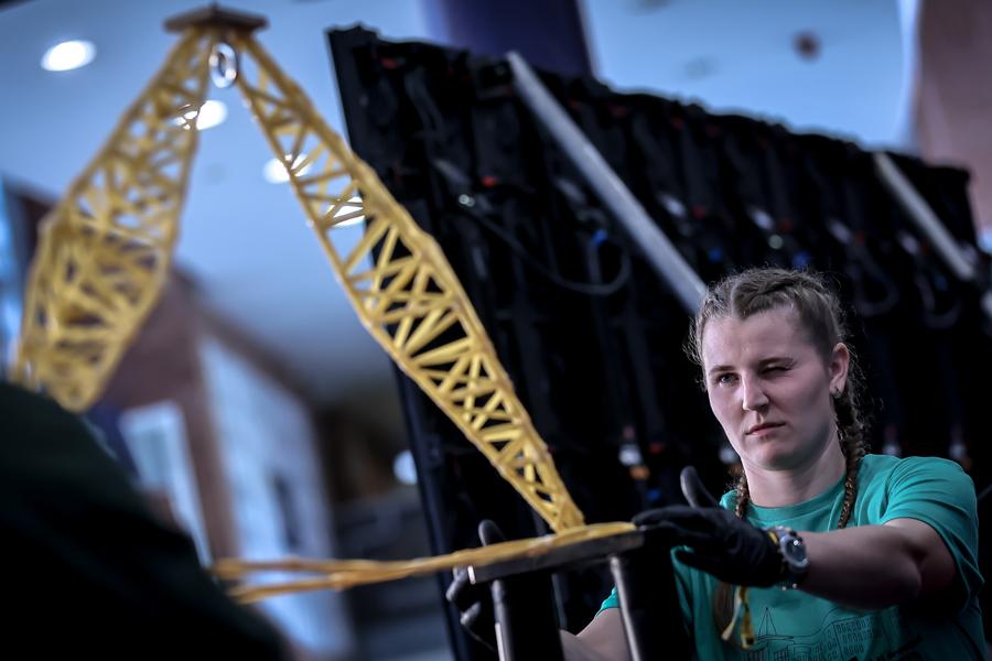 A contestant places a spaghetti bridge on the instrument used to test its load-bearing capacity at the 10th Jubilee World Championship in Spaghetti Bridge Building, held at Obuda University in Budapest, Hungary on May 29, 2025. (Photo by David Balogh/Xinhua)Contestants place a spaghetti bridge on the instrument used to test its load-bearing capacity at the 10th Jubilee World Championship in Spaghetti Bridge Building, held at Obuda University in Budapest, Hungary on May 29, 2025. (Photo by David Balogh/Xinhua)A contestant shows a spaghetti bridge at the 10th Jubilee World Championship in Spaghetti Bridge Building, held at Obuda University in Budapest, Hungary on May 29, 2025. (Photo by David Balogh/Xinhua)A spaghetti bridge is seen collapsed during a load-bearing capacity test at the 10th Jubilee World Championship in Spaghetti Bridge Building, held at Obuda University in Budapest, Hungary on May 29, 2025. (Photo by David Balogh/Xinhua)A contestant prepares to test the load-bearing capacity of a spaghetti bridge at the 10th Jubilee World Championship in Spaghetti Bridge Building, held at Obuda University in Budapest, Hungary on May 29, 2025. (Photo by David Balogh/Xinhua) ■