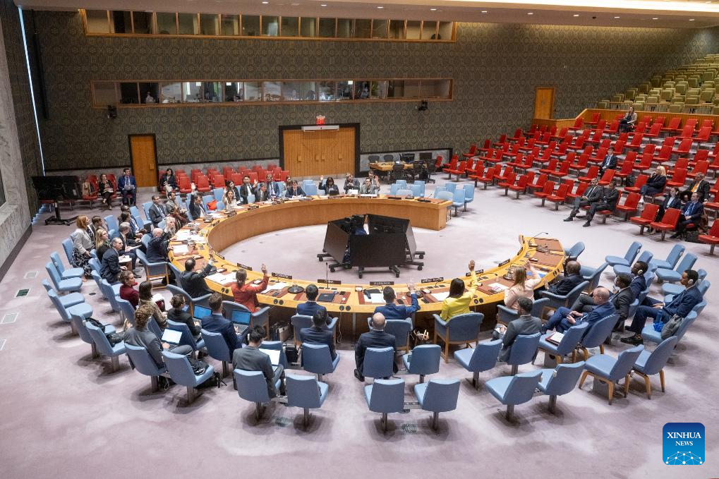 Representatives vote on a draft resolution during a UN Security Council meeting at the UN headquarters in New York, on May 29, 2025. (Eskinder Debebe/UN Photo/Handout via Xinhua)