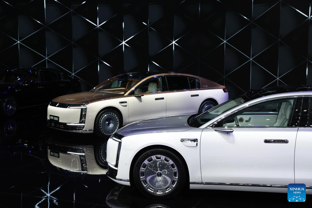 Visitors look at vehicles at the booth of Hongqi during the 2025 Guangdong-Hong Kong-Macao Greater Bay Area International Auto Show in Shenzhen, south China's Guangdong Province, May 31, 2025. (Xinhua/Liang Xu)