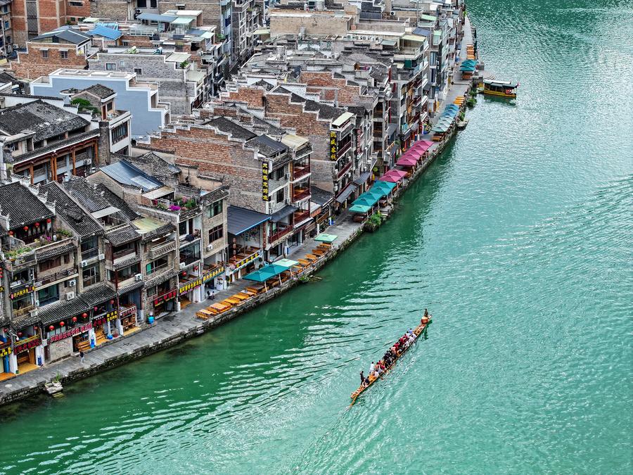 Locals row a dragon boat in Zhenyuan ancient town in Qiandongnan Miao and Dong Autonomous Prefecture in southwest China's Guizhou Province, May 20, 2025. (Xinhua/Ou Dongqu)